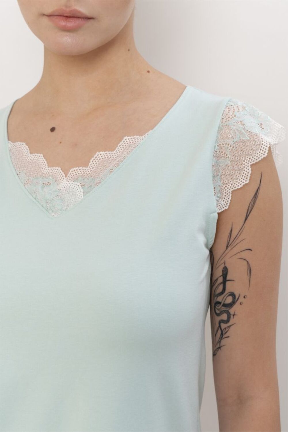 Пижама женская состоит из топа на широком плече и брюк, зауженных к низу. Вырез горловины топа V-образный, декорирован кружевной вставкой. Пройма декорирована кружевом. Брюки свободного прилегания, заужены к низу. Пояс – мягкая резинка. По низу брюк кружевные вставки.
