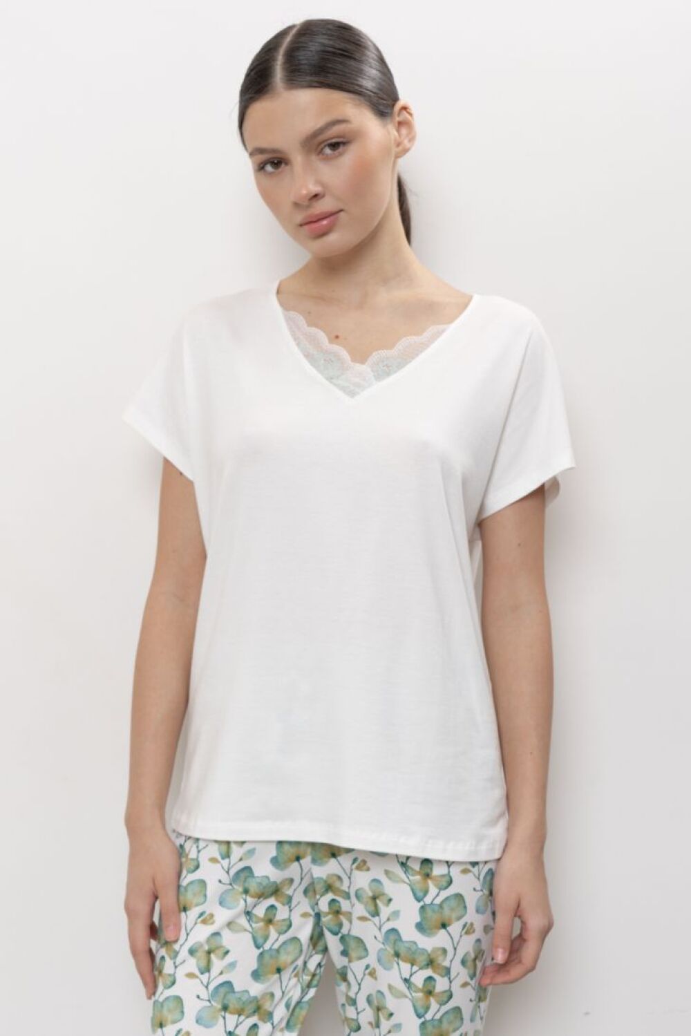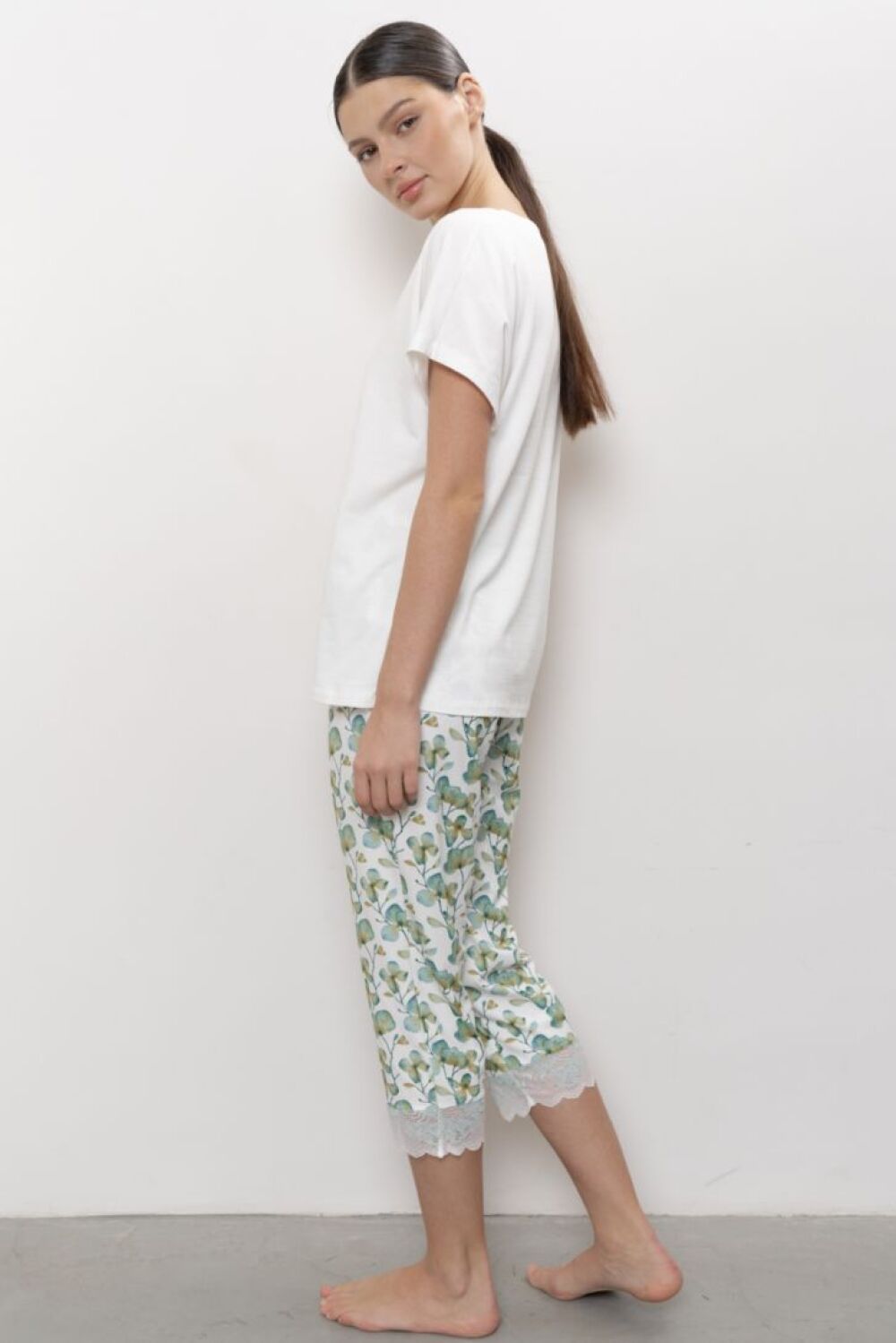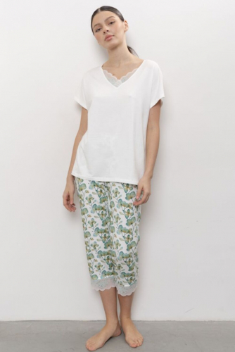 Пижама состоит из футболки свободного прилегания со спущенным рукавом. Вырез горловины V-образный, декорирован кружевной вставкой. Брюки укороченные, полуприлегающего силуэта на мягком поясе с кружевной вставкой по низу.