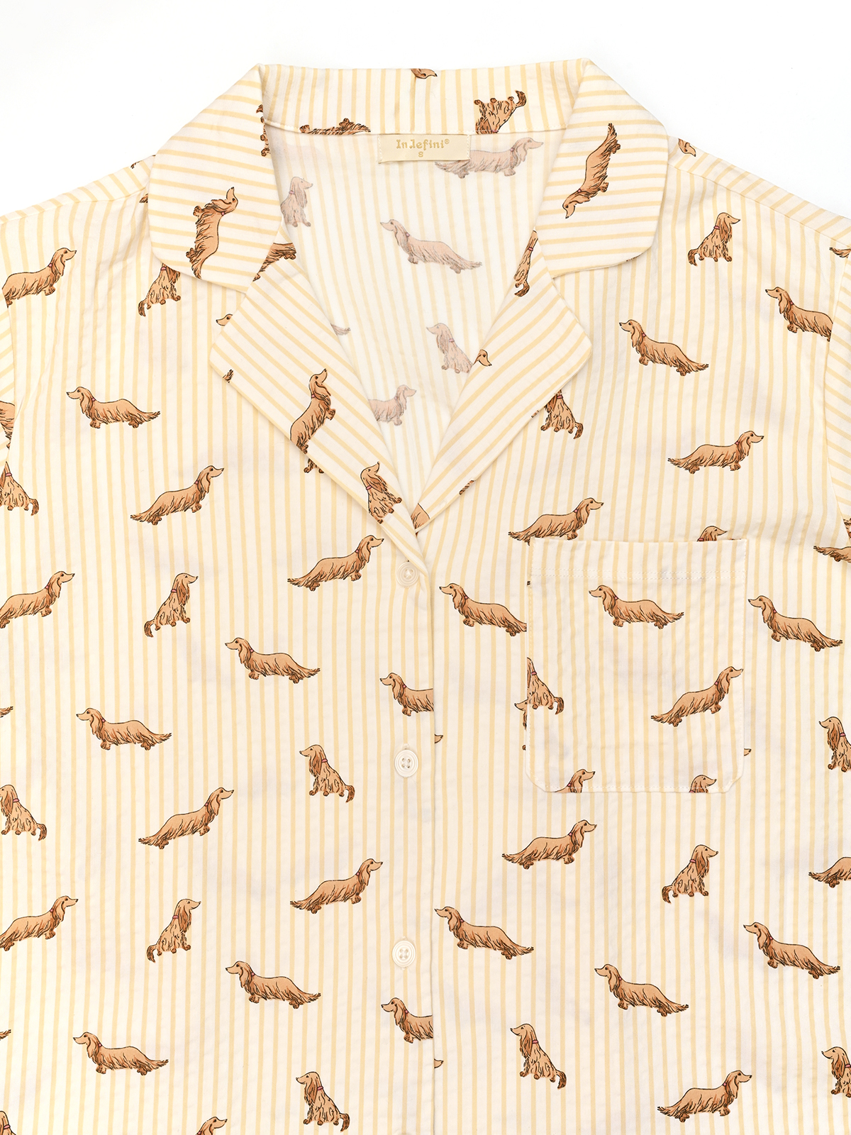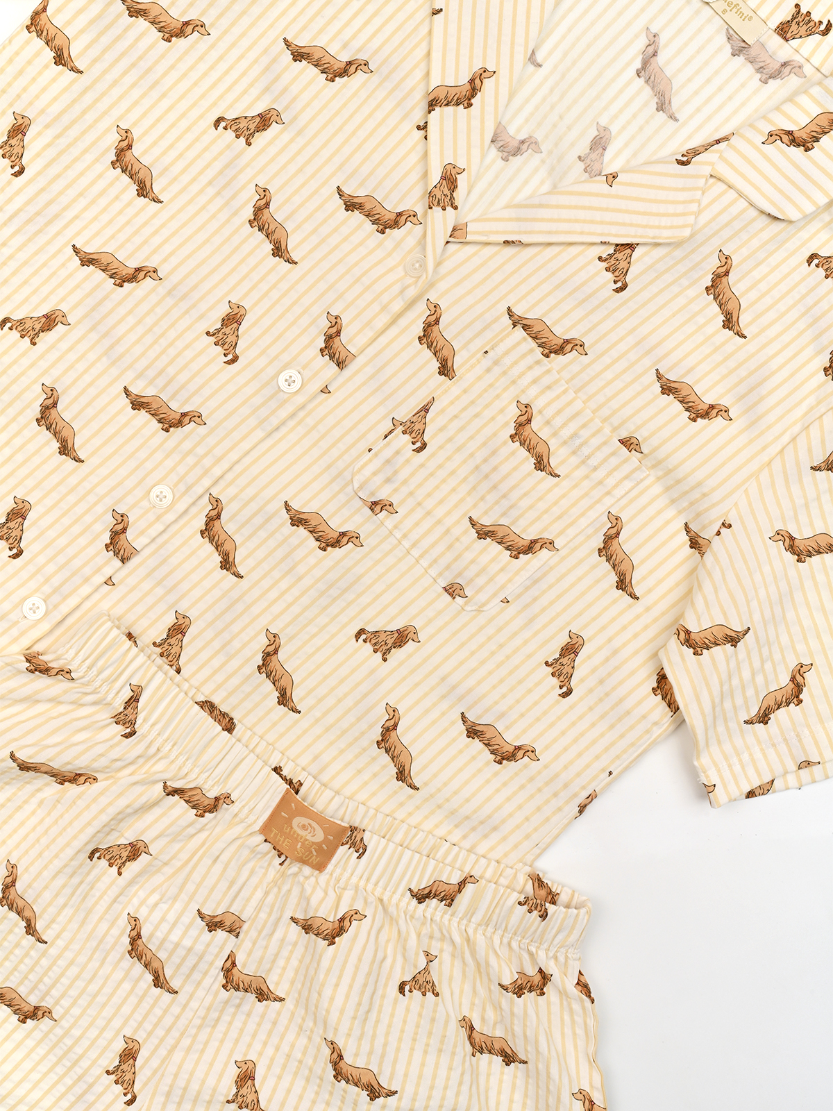 Пижама в молочном оттенке с принтом. Сшита из нежной к коже вискозе и дышащего хлопка, подходит для любого времени года. Рубашка прямого кроя с пуговицами в тон и аккуратным нагрудным карманом. Шорты с плотной эластичной резинкой.