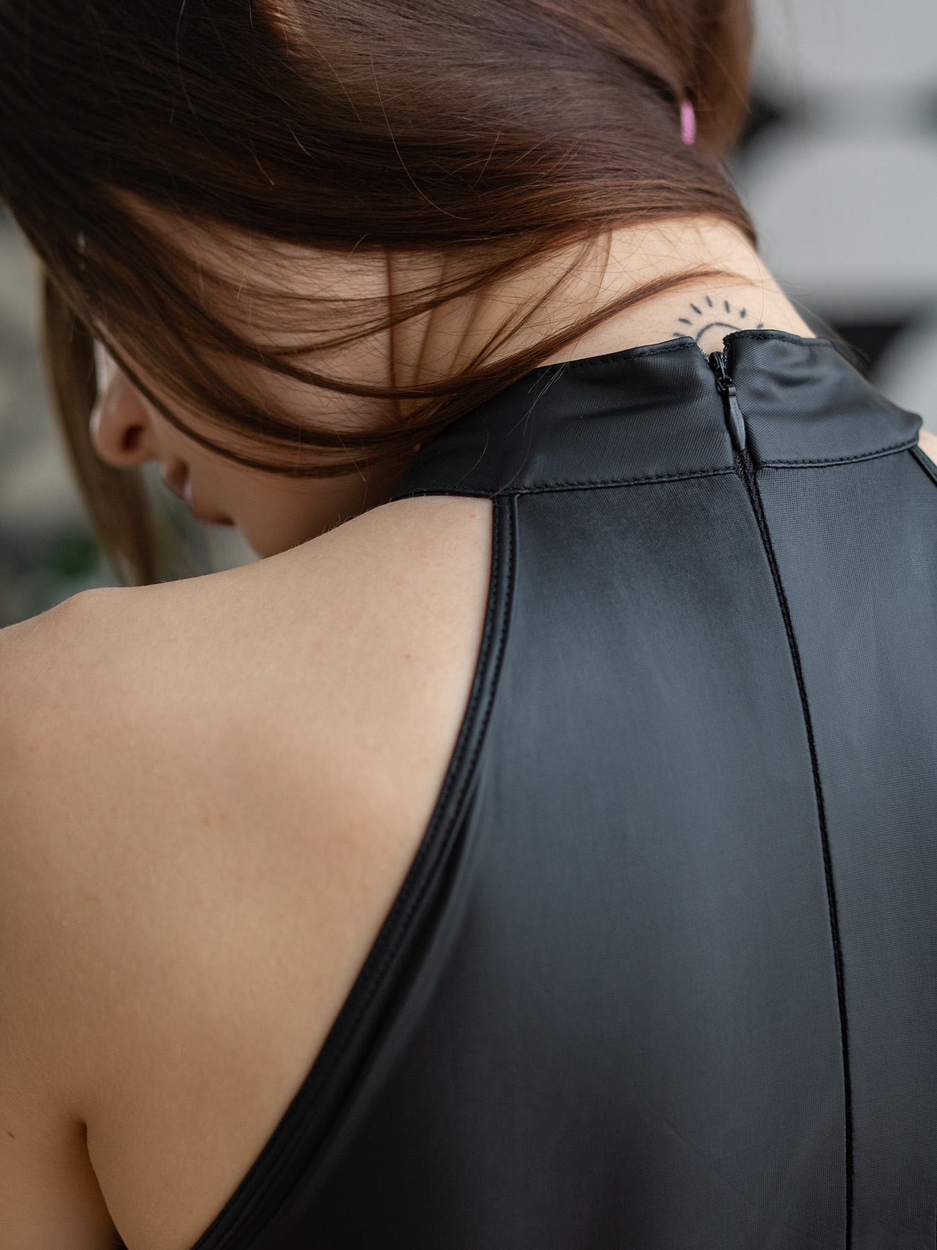 Платье из эластичной экокожи с сетчатой вставкой спереди. Воротник-стойка. Американская пройма соблазнительно открывает плечи. В нем Вы - звезда дискотек, гламурных вечеринок и рок-пати.