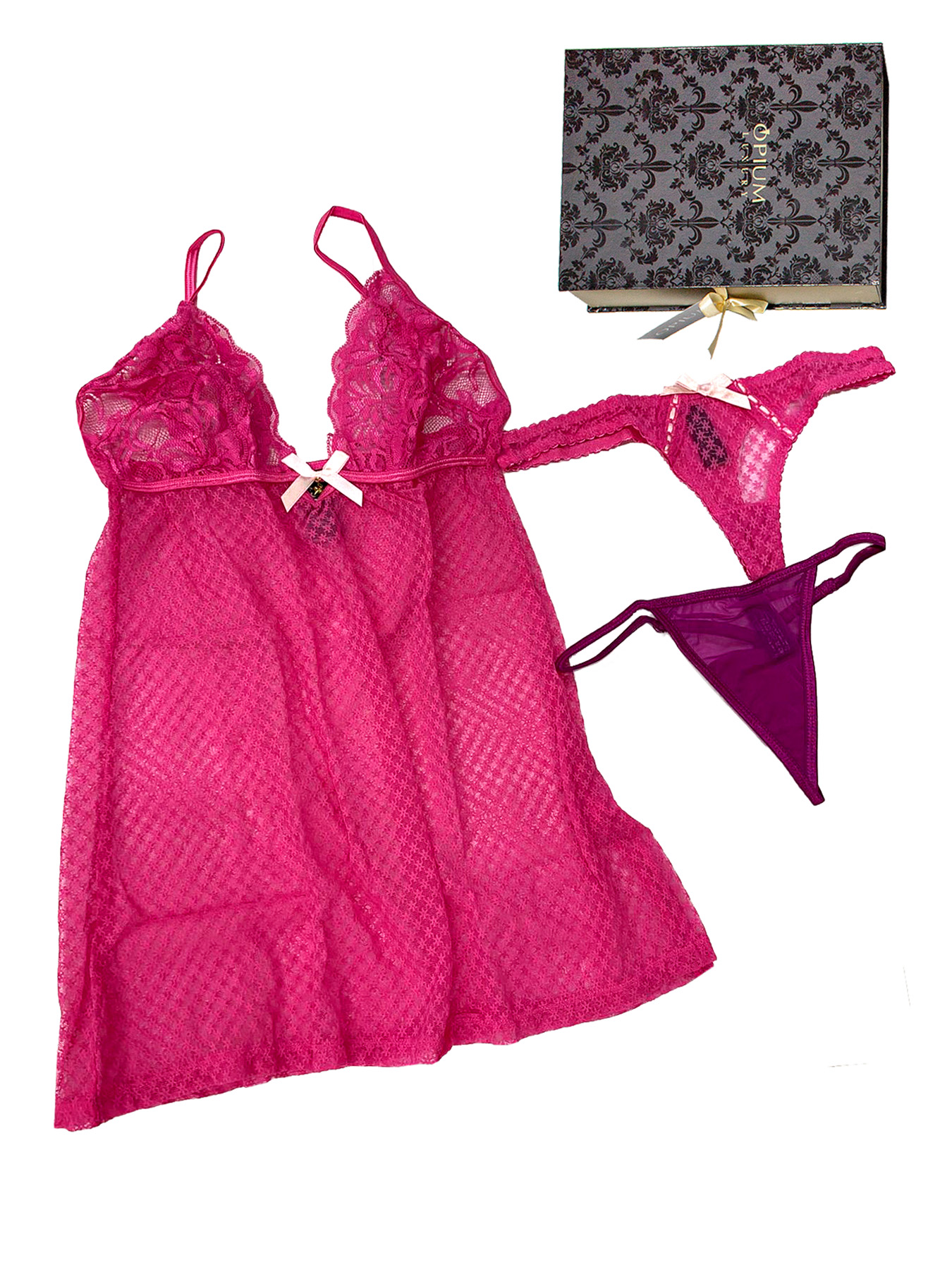 Великолепный подарок в шикарной упаковке понравится любой девушке. В коробке, напоминающей драгоценную шкатулку, бережно упакован комплект нижнего белья: комплект из ультраактуальной полупрозрачной ткани "сетка" и нежного кружева включает необычайно сочного и эротичного цвета неглиже и двое трусиков-стринг. Порадуйте себя любимую или близкого человека роскошным презентом.