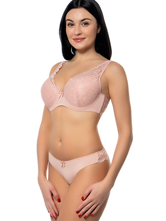 Пыльная_роза 40, 42, 44, 46 Трусы бразилианы со средней линией талии. Передняя деталь выполнена из гладкого эластичного полотна, задняя – из кружева. Ластовица из хлопкового полотна. 80% полиамид, 5 % хлопок, 15% эластан