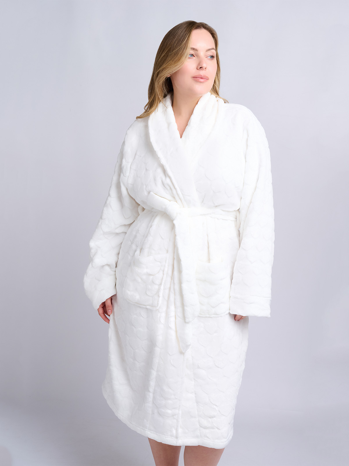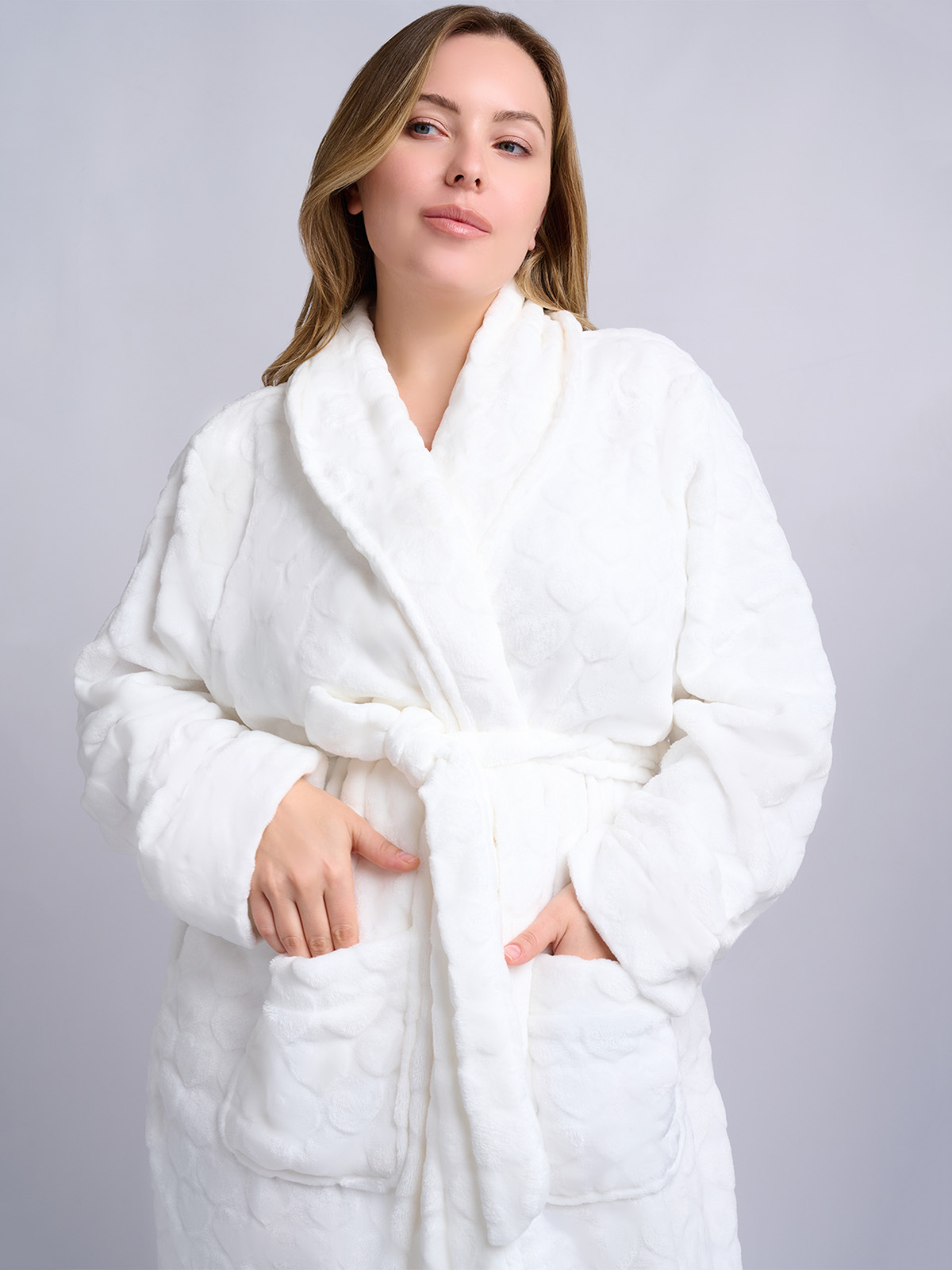 Мягкий белый халат 5178SYC от бренда indefini выполнен из приятного на ощупь и легкого материала.