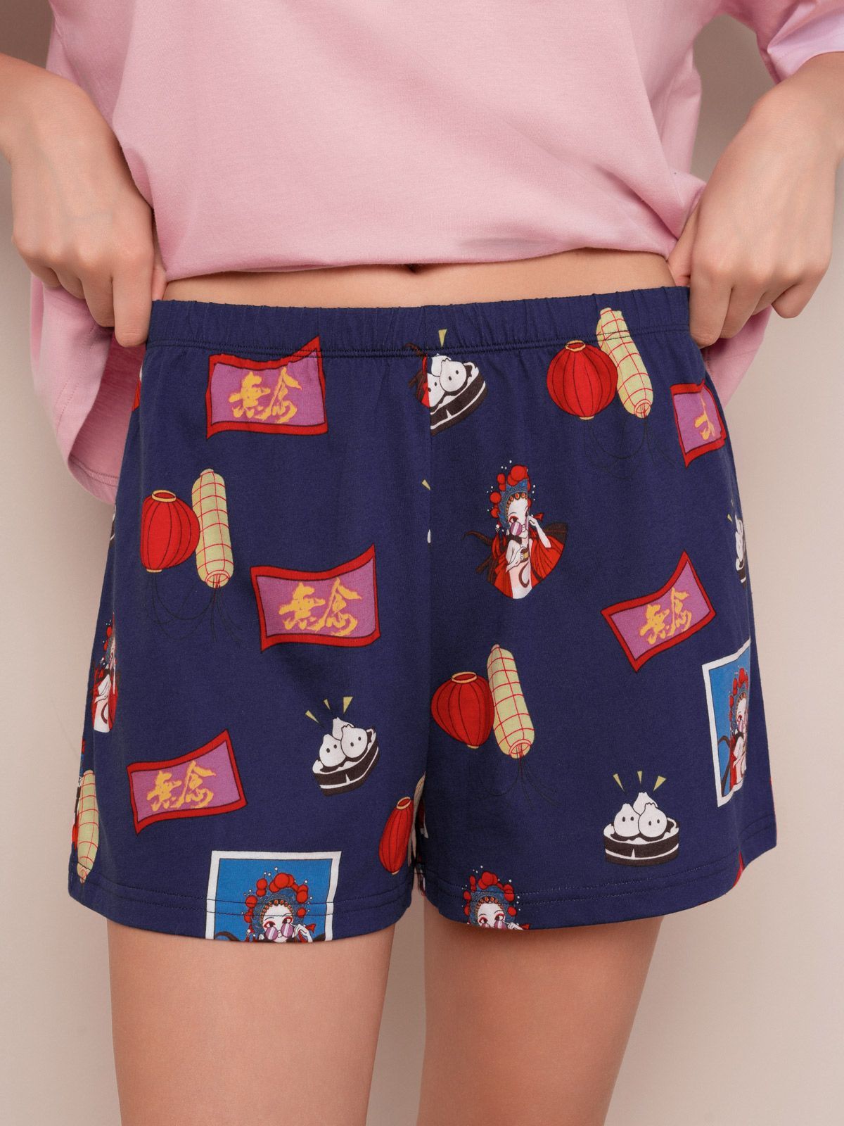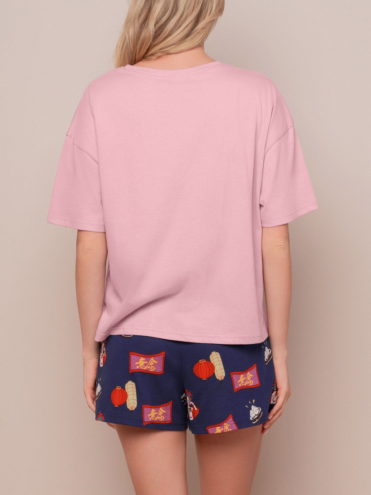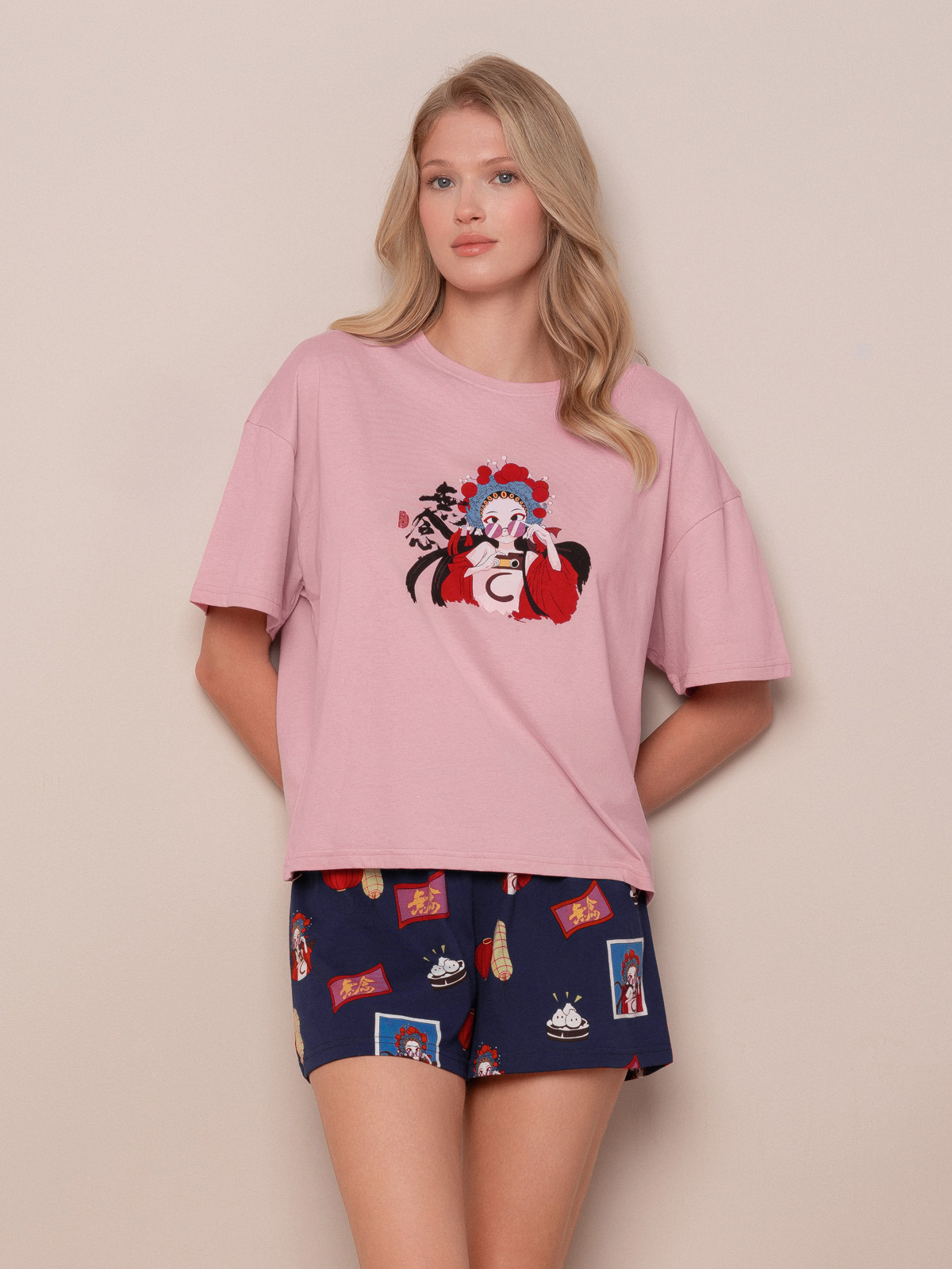 Комплект включает розовую футболку с принтом с изображением девушки и синие шорты с принтом и мягкой эластичной резинкой для удобной посадки на талии.
