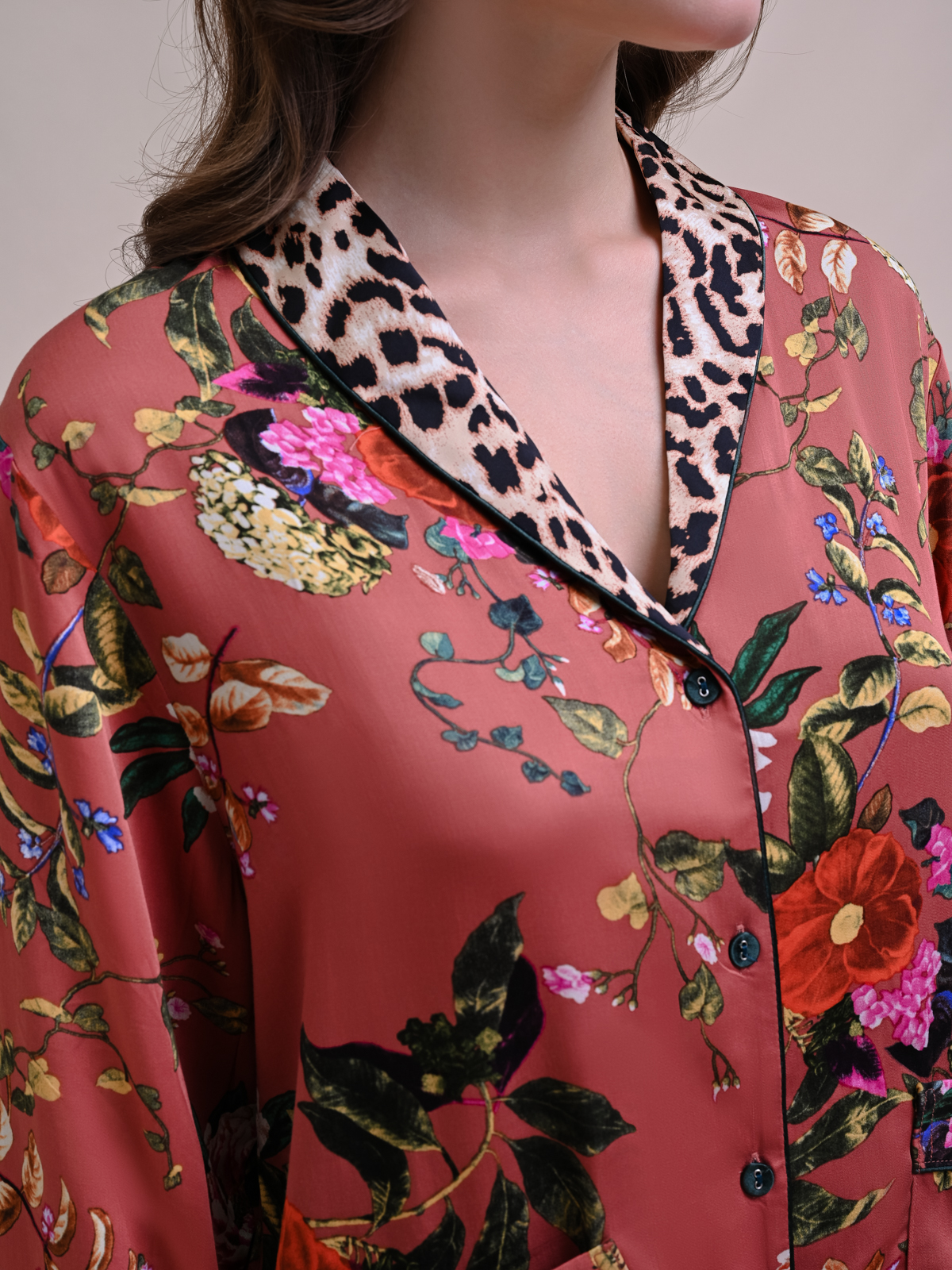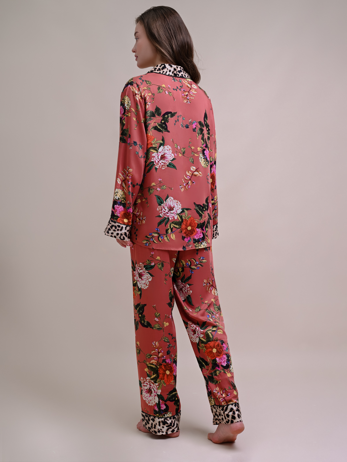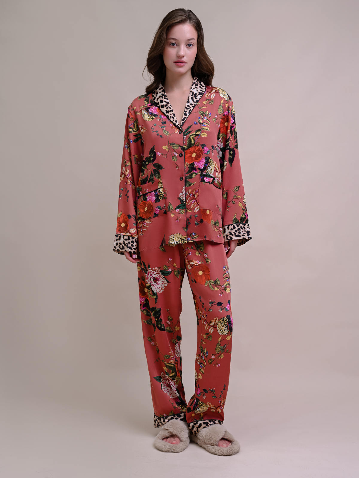 Домашняя пижама от торговой марки Индефини.  В комплекте рубашка с брюками.  Рубашка из вискозы, красно-коричневого цвета, с цветочным принтом, со вставками леопардового принта, с длинными рукавами, с воротником-отворотом, с кармашками по бокам, на пуговичках, прямая, свободного кроя.  Брюки из вискозы, красно-коричневого цвета, с цветочным принтом, со вставками леопардового принта, на мягкой резинке, прямые, свободного кроя.