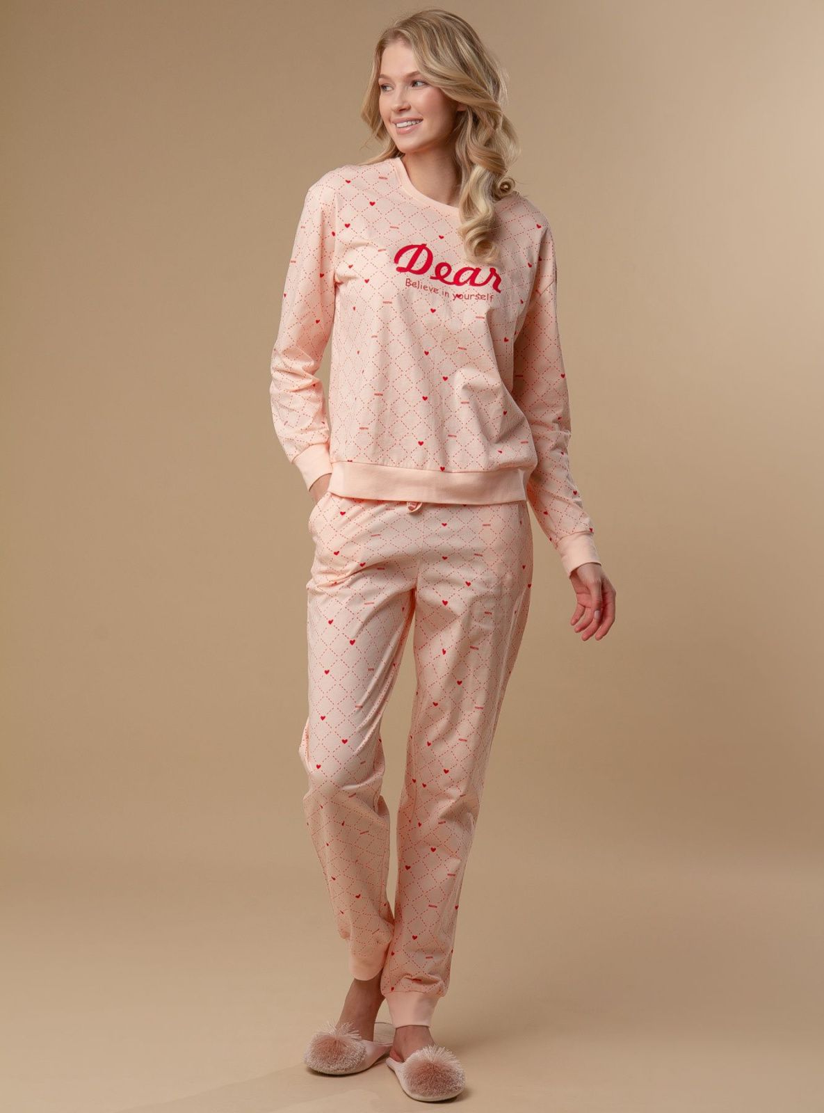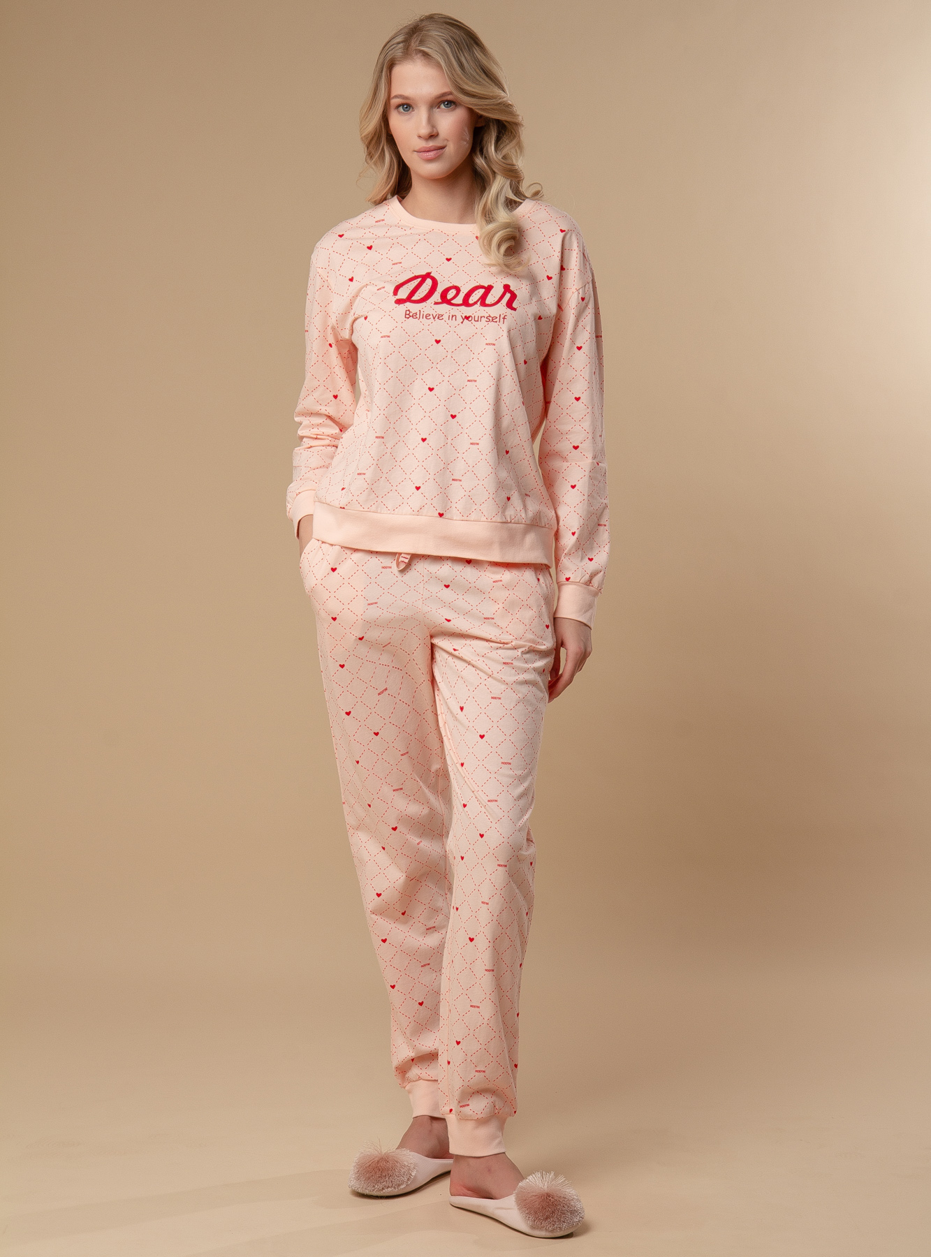 Женская пижама торговой марки Indefini, материнская серия. Женская пижама для девочек представляет собой комплект из кофты и брюк, созданные хлопка, обеспечивающем хорошую вентиляцию и воздухопроницаемость. Ткань мягкая и не растягивается после стирки.Кроме того, в костюме применен более популярный в этом году дизайн в форме ромба и принт в форме сердца, а комплект из серии "родитель-ребенок" создан для того, чтобы чувствовать себя полным любви. На пижаму нанесен яркий принт с мотивирующей надписью "Верь в себя" и рисунками сердечек. Эта женская пижама будет поддерживать уверенность и позитивное настроение у девушек и женщин, а также обеспечивать комфорт и уют во время сна. Верхний дизайн выполнен в более популярном в настоящее время дизайне с курсивными буквами.