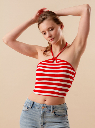 Верхняя часть в виде футболки с отложным воротником и пуговицами в тон ткани.