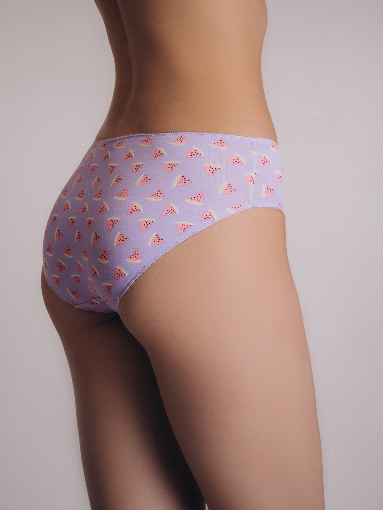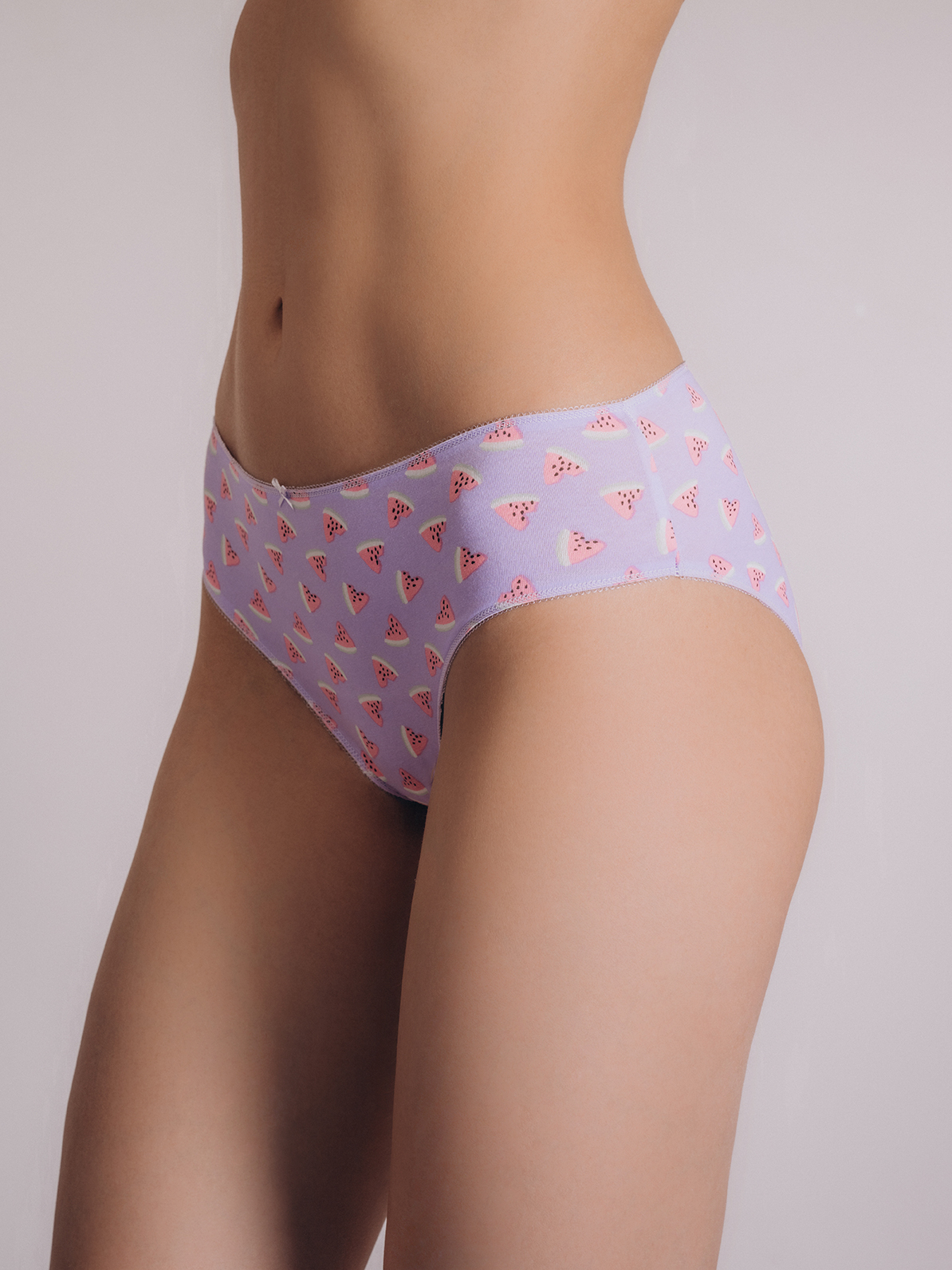 Сиреневые трусы-слипы от бренда Indefini с ярким принтом в виде дольек арбуза. Модель выполнена из мягкого хлопка с добавлением эластана, что обеспечивает отличную посадку и комфорт в течение дня. Эластичная окантовка мягко фиксирует изделие на талии, не сдавливая кожу, а небольшой бантик спереди добавляет игривый акцент.