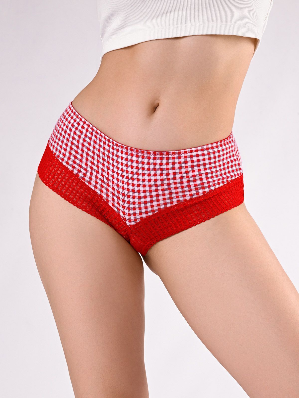 Принт в красно-белую клетку добавляет образу игривую нотку, а элегантное кружевное обрамление придаёт трусам женственность и утонченность.