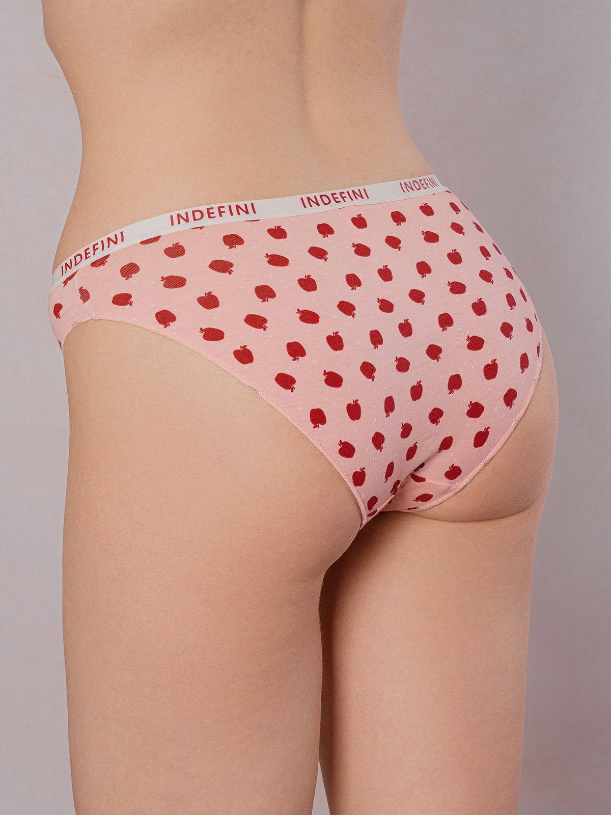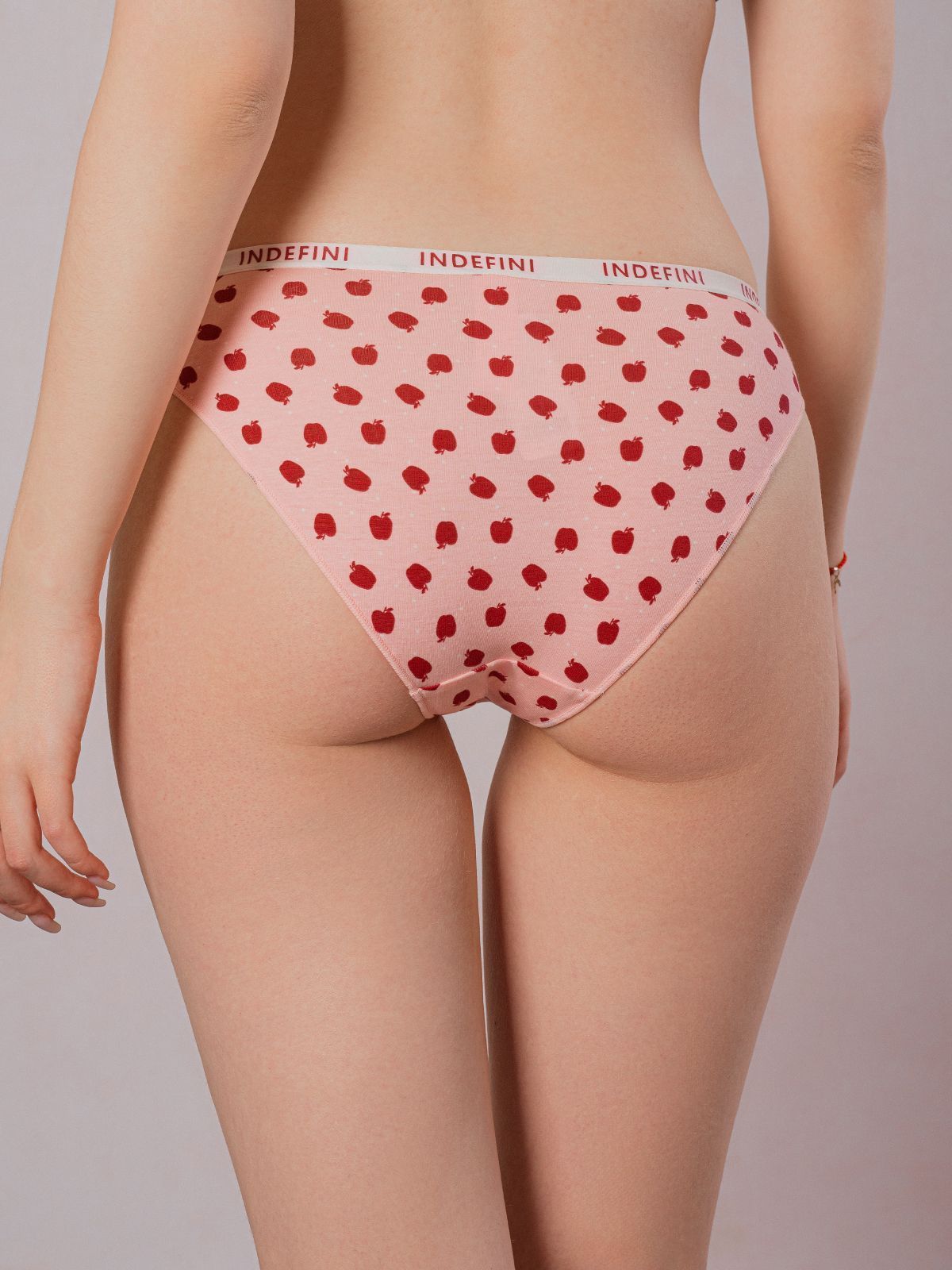 Трусы слипы женские, изготовленные из хлопкового материала, выполнены в классическом розовом цвете. Мягкая эластичная резинка на талии украшена надписью INDEFINI. На внутренней стороне трусов имеется хлопковая ластовица. На трусы нанесен принт с изображением яблок.