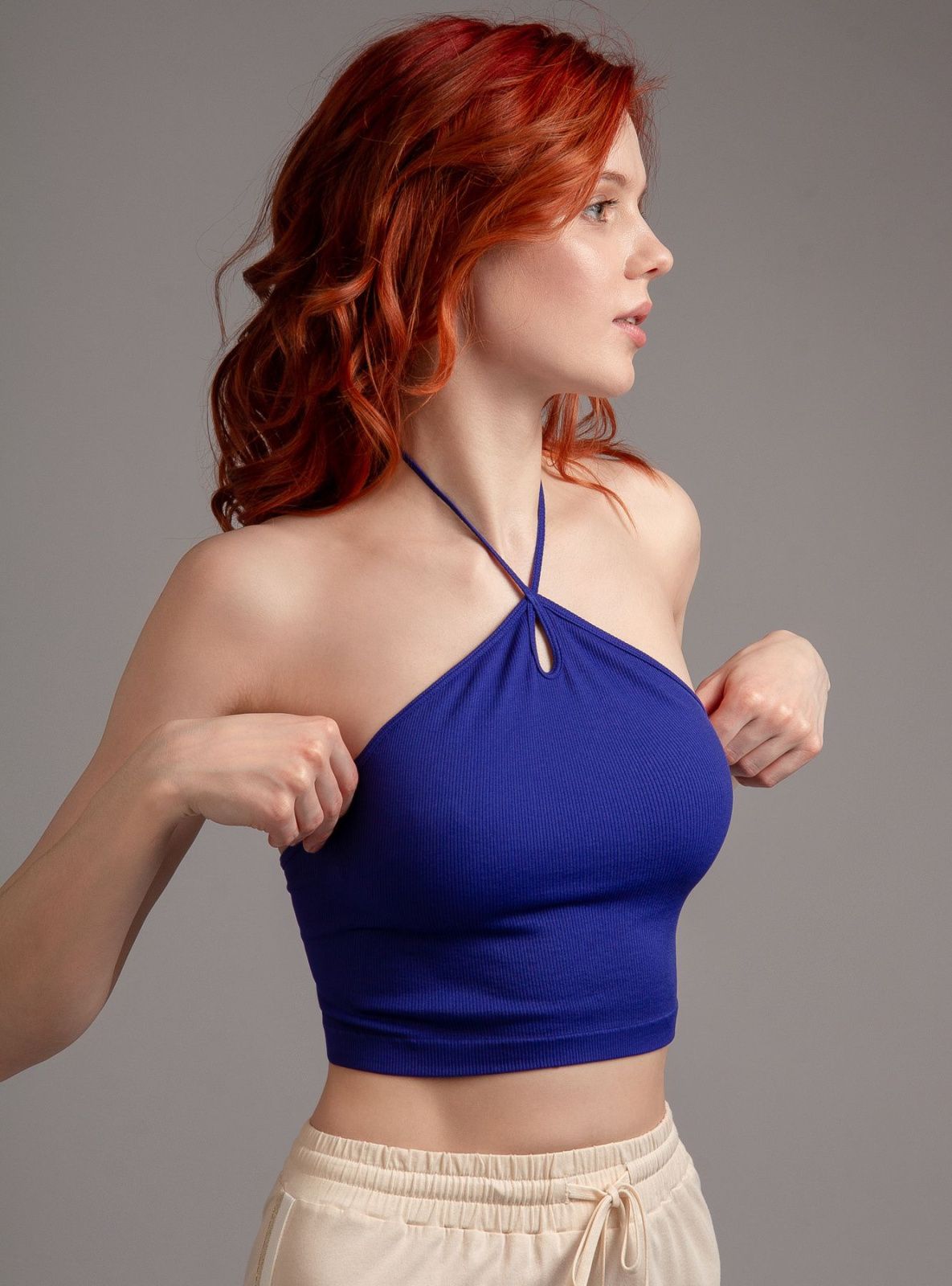 Топ из полиамида, синего цвета, в рубчик, на завязках, без рукавов, укороченный.