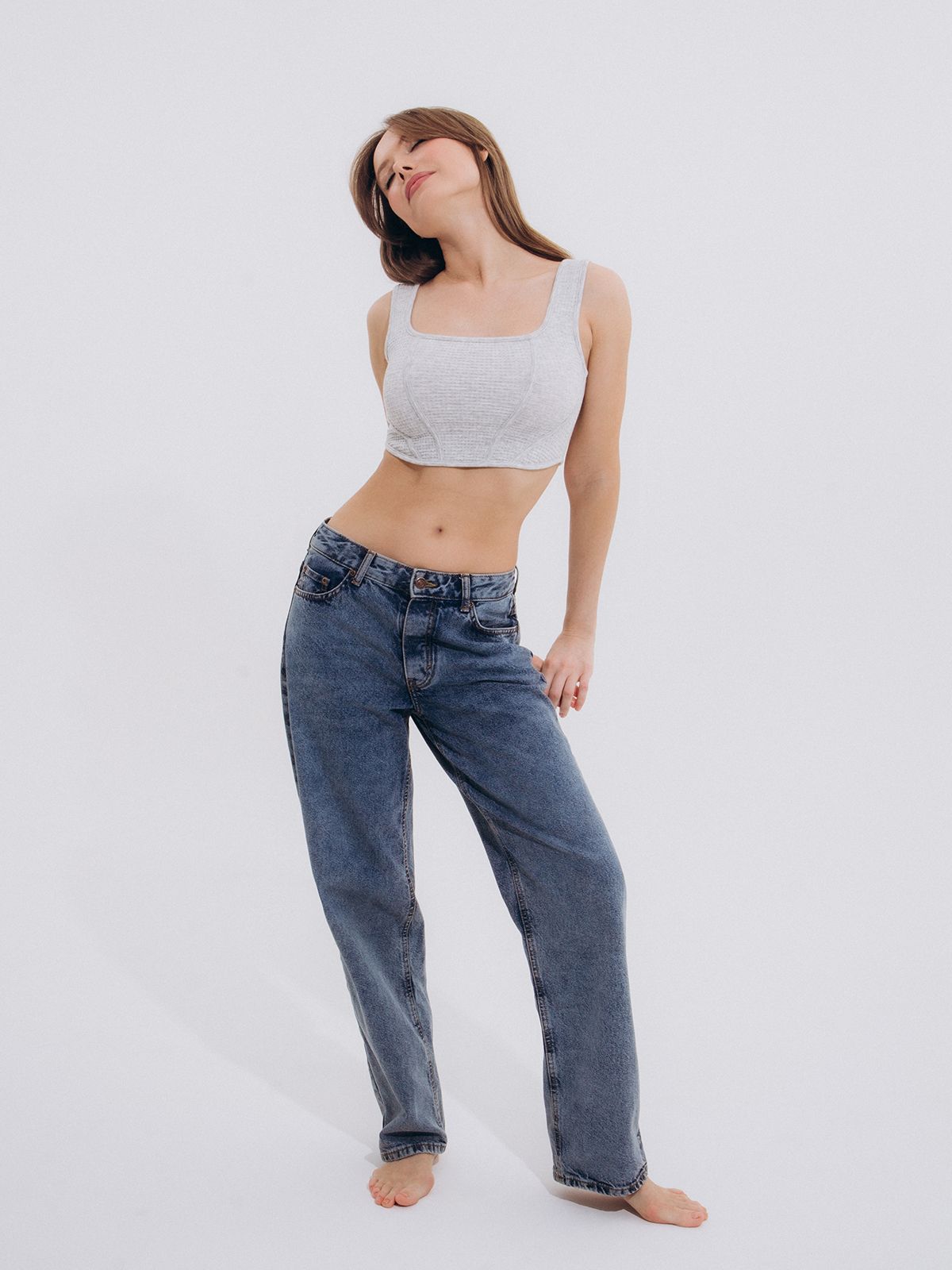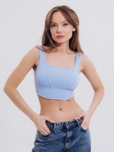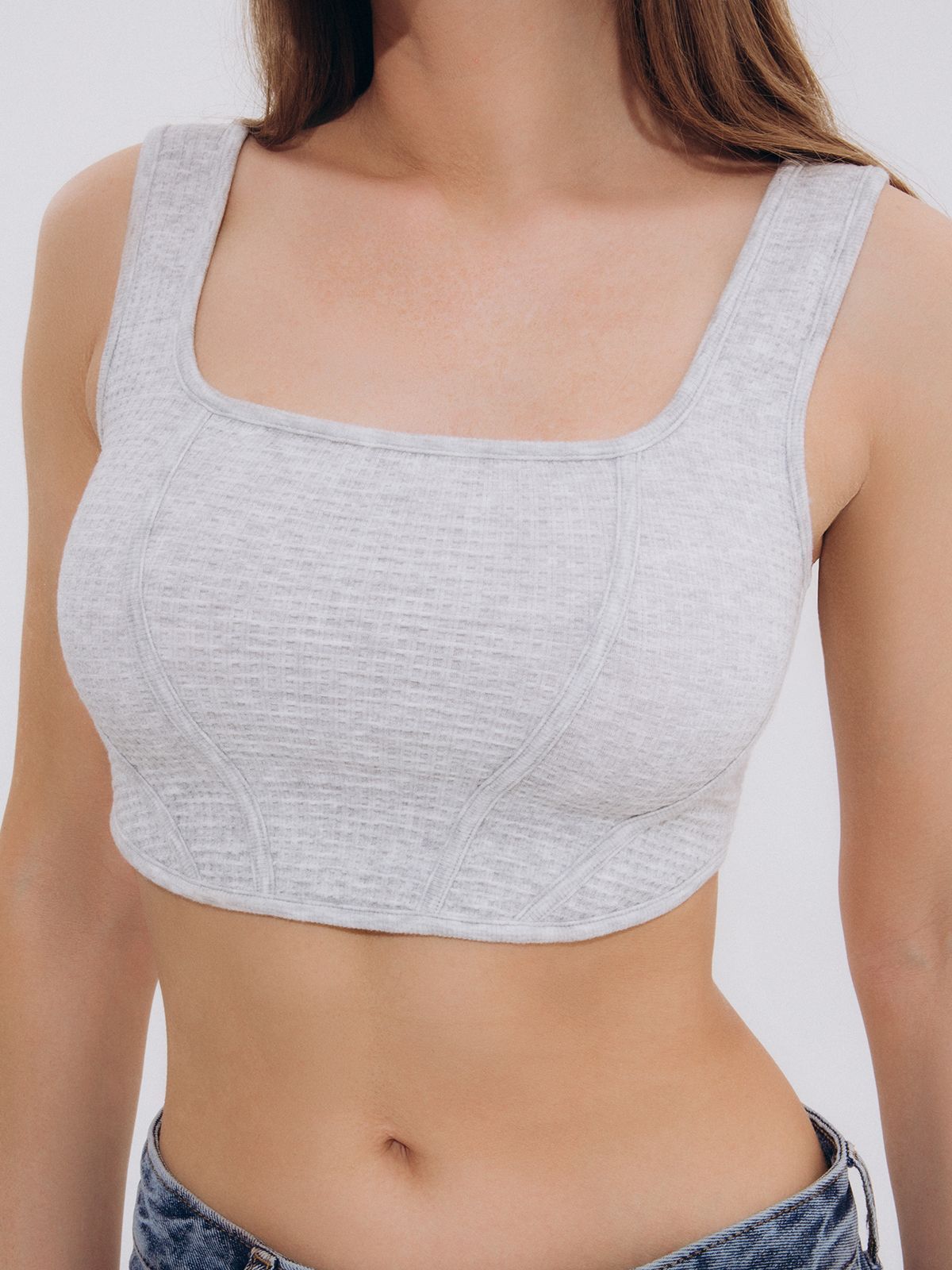Выполненный в сером цвете, он имеет фактурную ткань и широкие бретели.