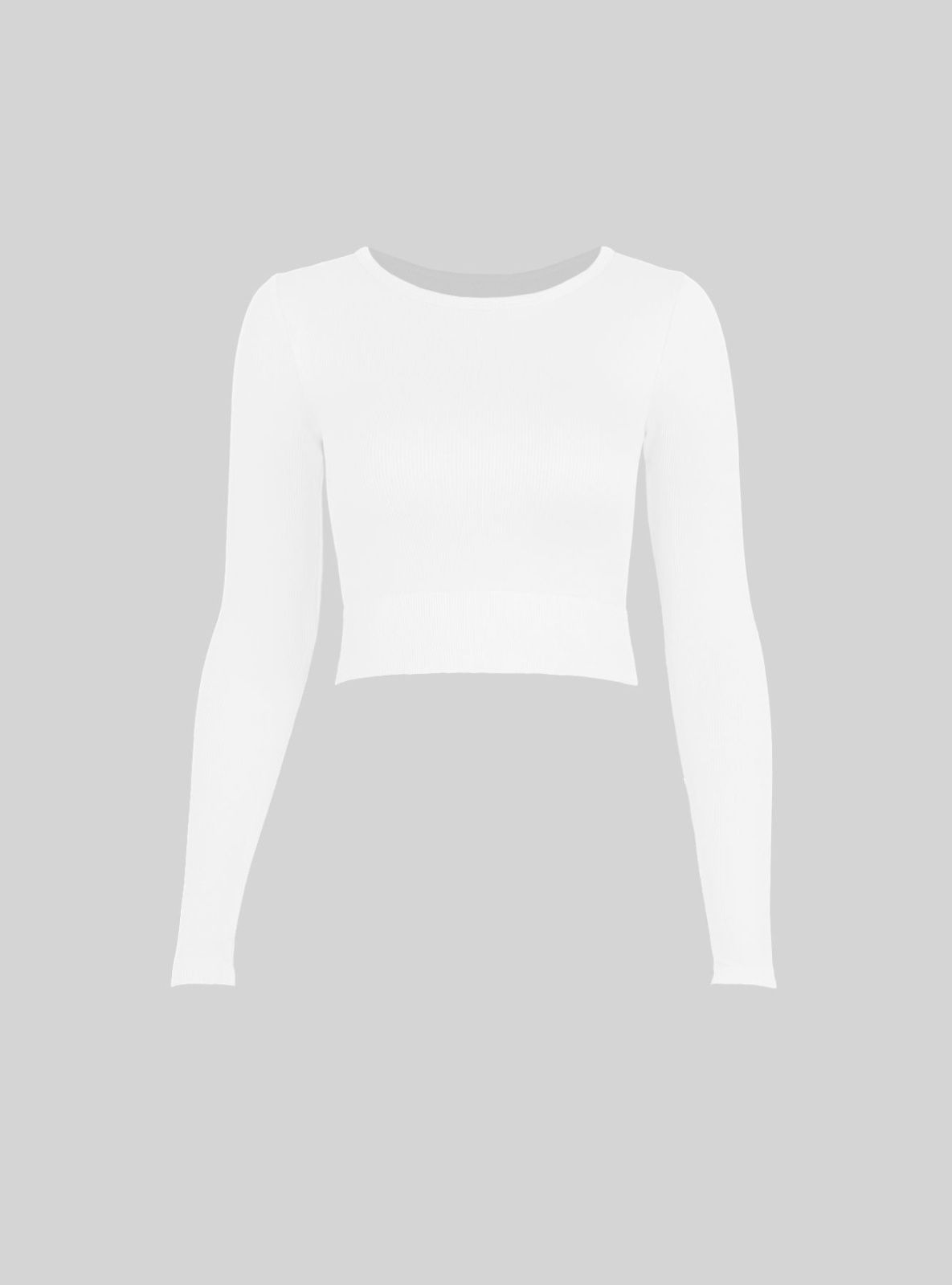 Лонгслив из полиамида, белого цвета, в рубчик, с длинными рукавами, облегающий, укороченный, на мягкой резинке.