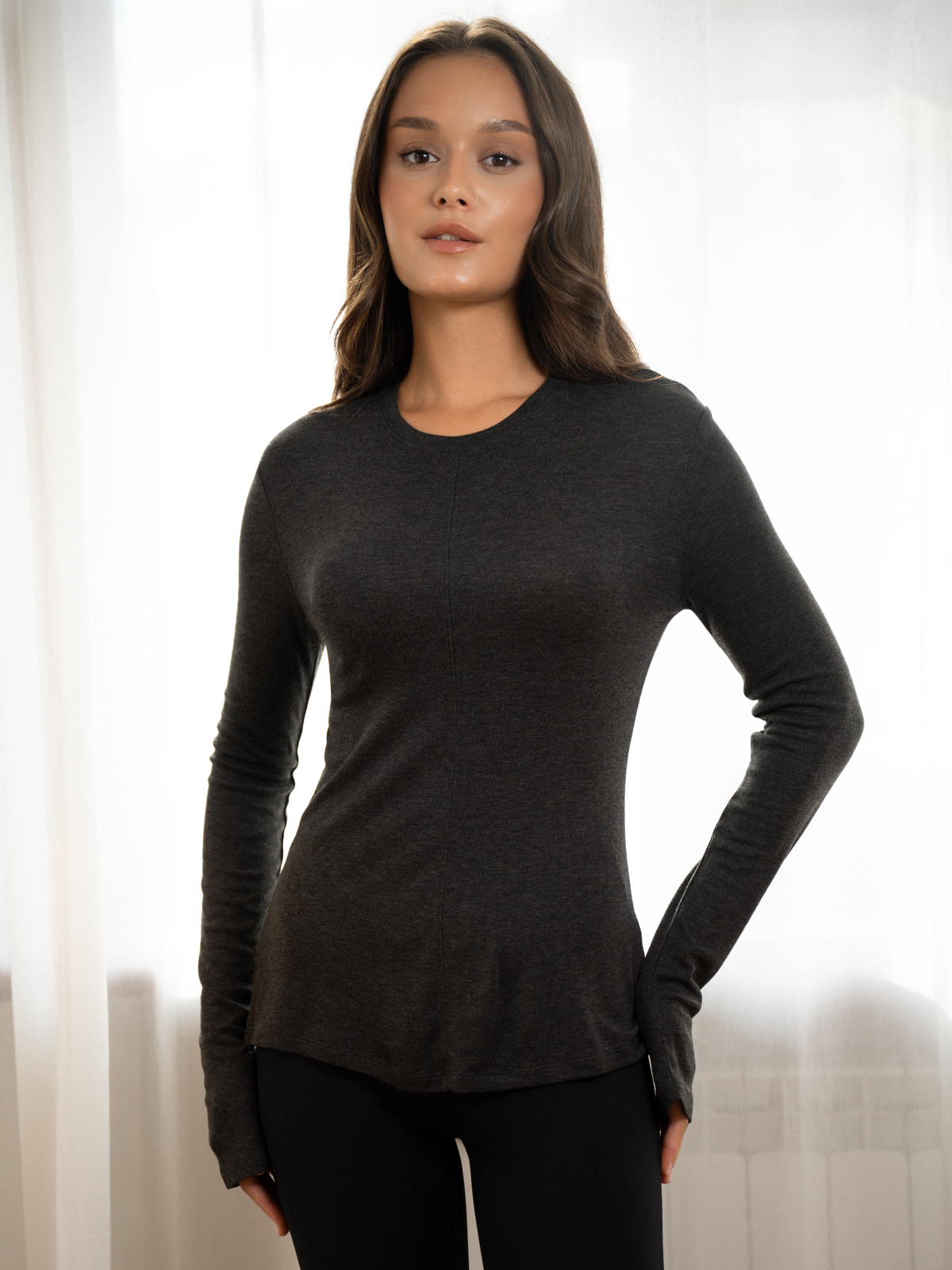 Женский лонгслив Indefini выполнен в глубоком темно-сером оттенке с едва заметной меланжевой текстурой — идеальный выбор для тех, кто ценит сдержанную элегантность и безупречный крой. Модель с длинными рукавами и круглым вырезом создана для повседневного комфорта и легкой универсальности.
