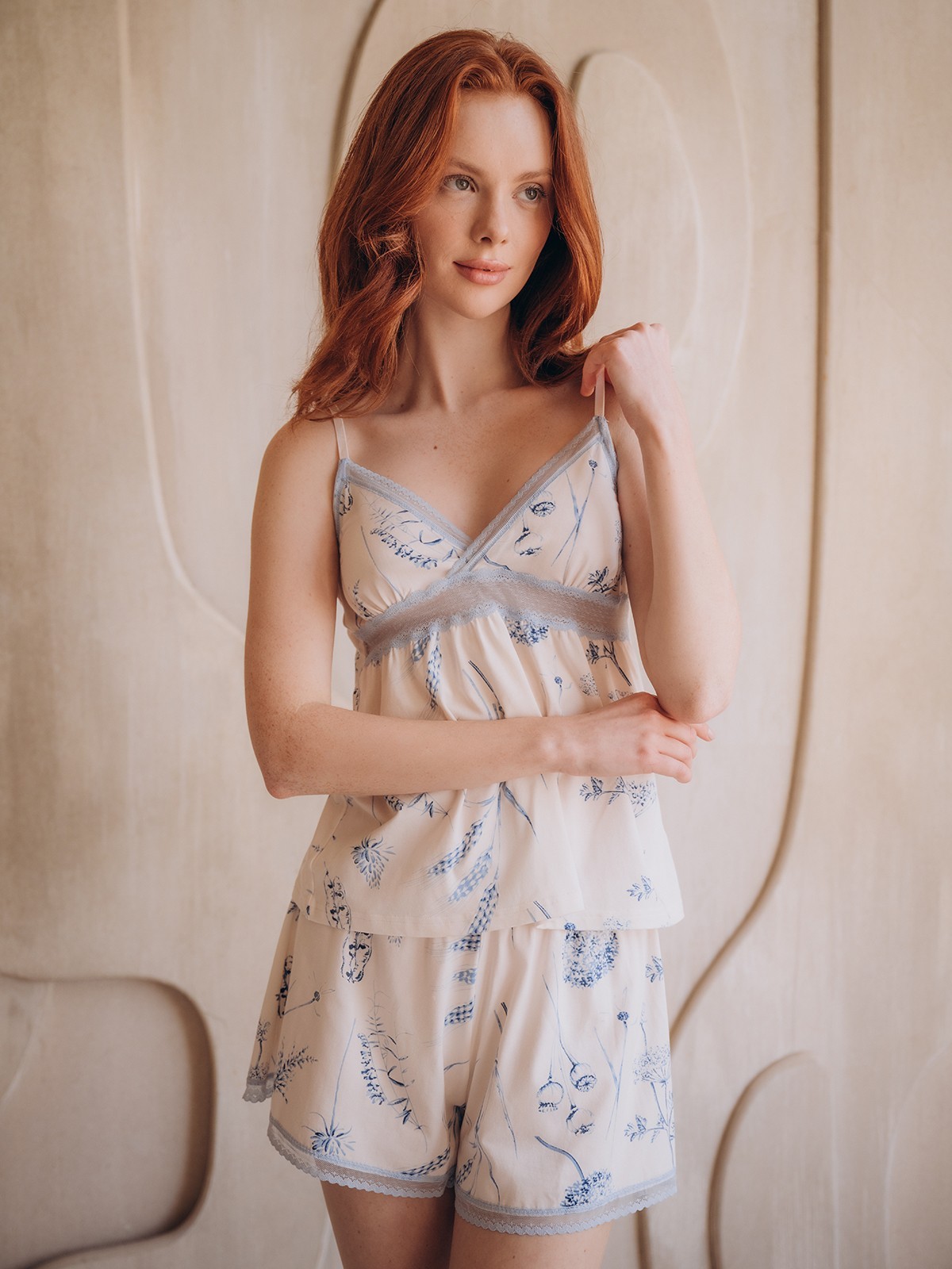 Пижама выполнена в белом цвете с нанесенным синим цветочным принтом.