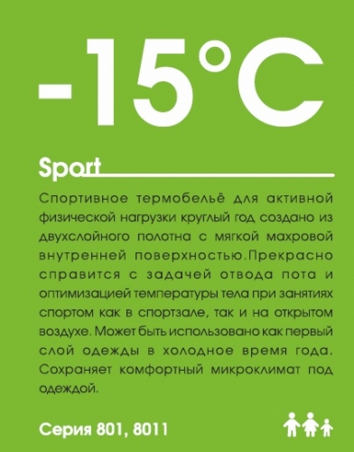 SPORT -15 Хорошо сохраняет тепло при температуре до 15-20°C и эффективно отводит влагу от тела при высокой активности 60% полиэстер; 40% полипропилен
