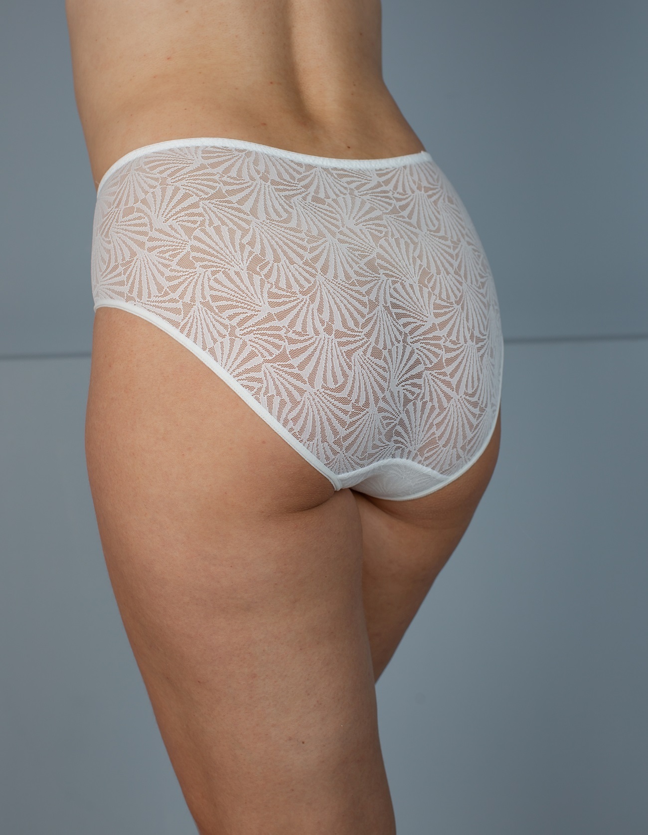Трусы с высокой посадкой, выполнены из эластичного и мягкого кружевного полотна и эластичной сетки.