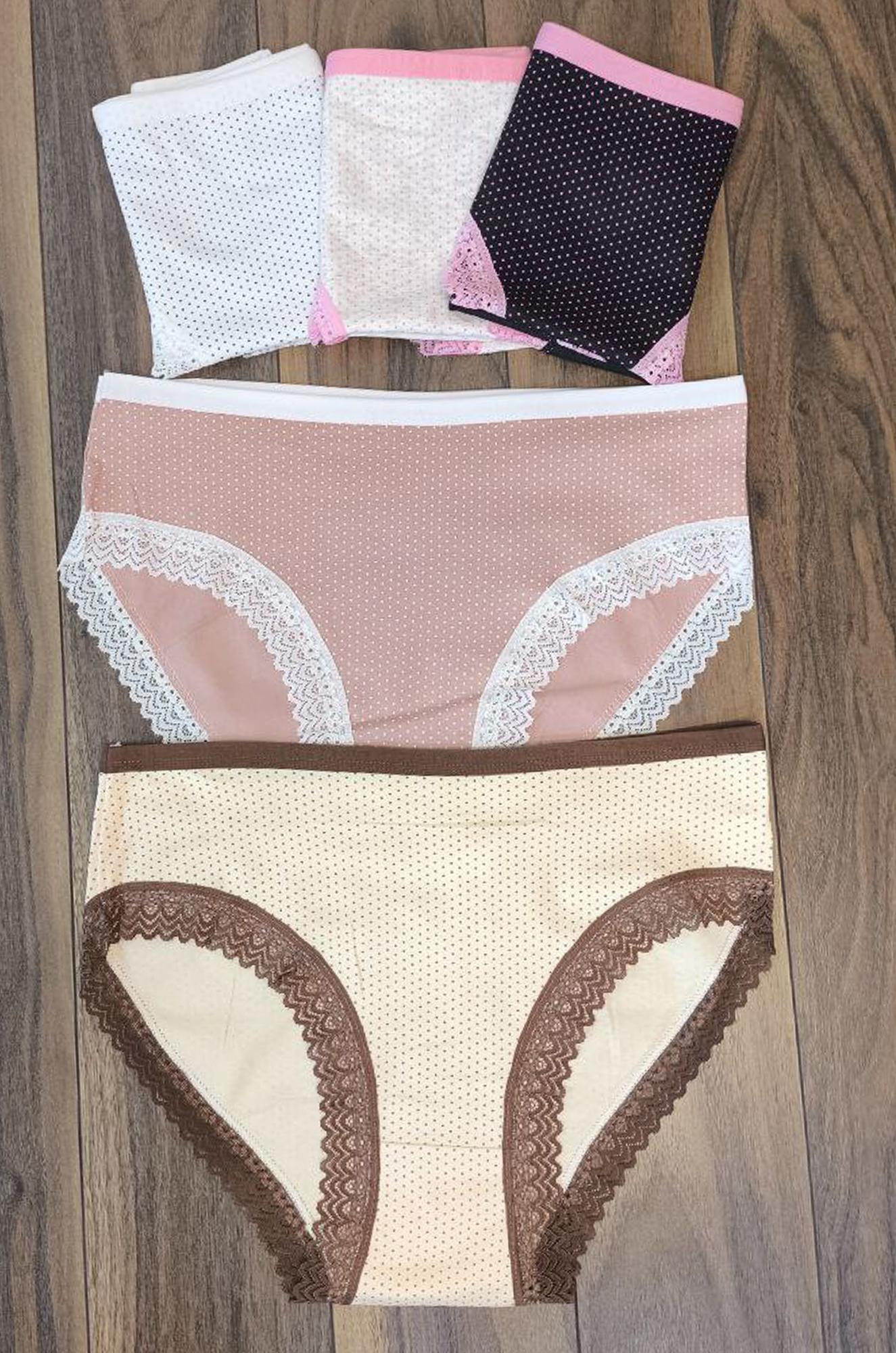 Симпатичная, удобная молодёжная модель трусиков-слипов. Ткань плотный хлопок, набивной рисунок "горошек", по краю кружевная отделка.