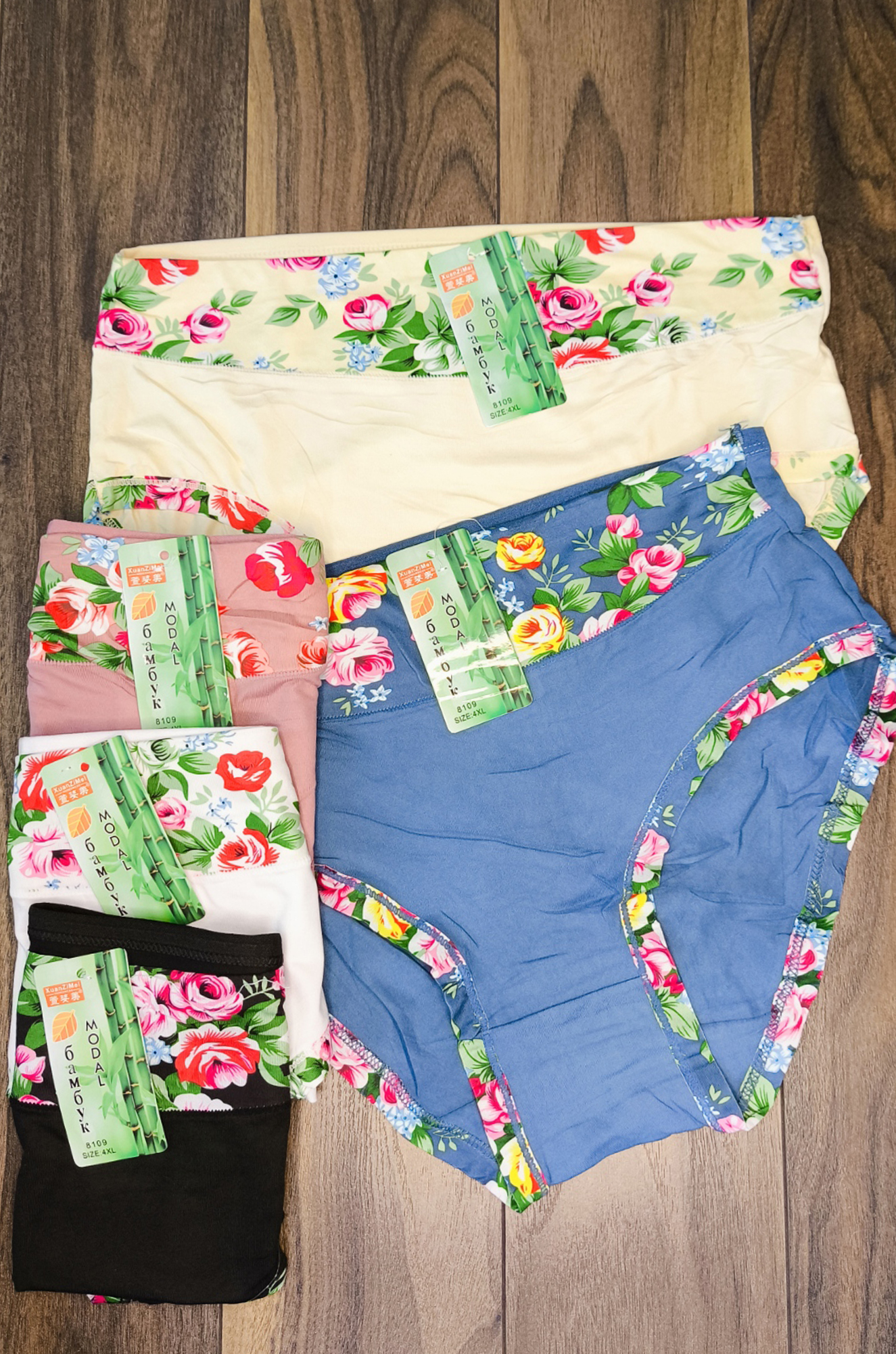 Однотонные женские трусики с эффектным цветочной отделкой из мягкой, нежной и шелковистой бамбуковой нити. Комфортный широкий пояс. Модель высокой посадки, для дам с пышными формами. Производство - Китай.