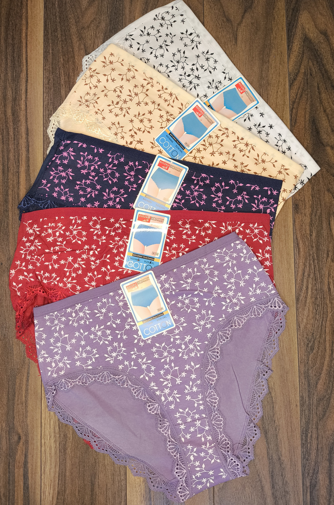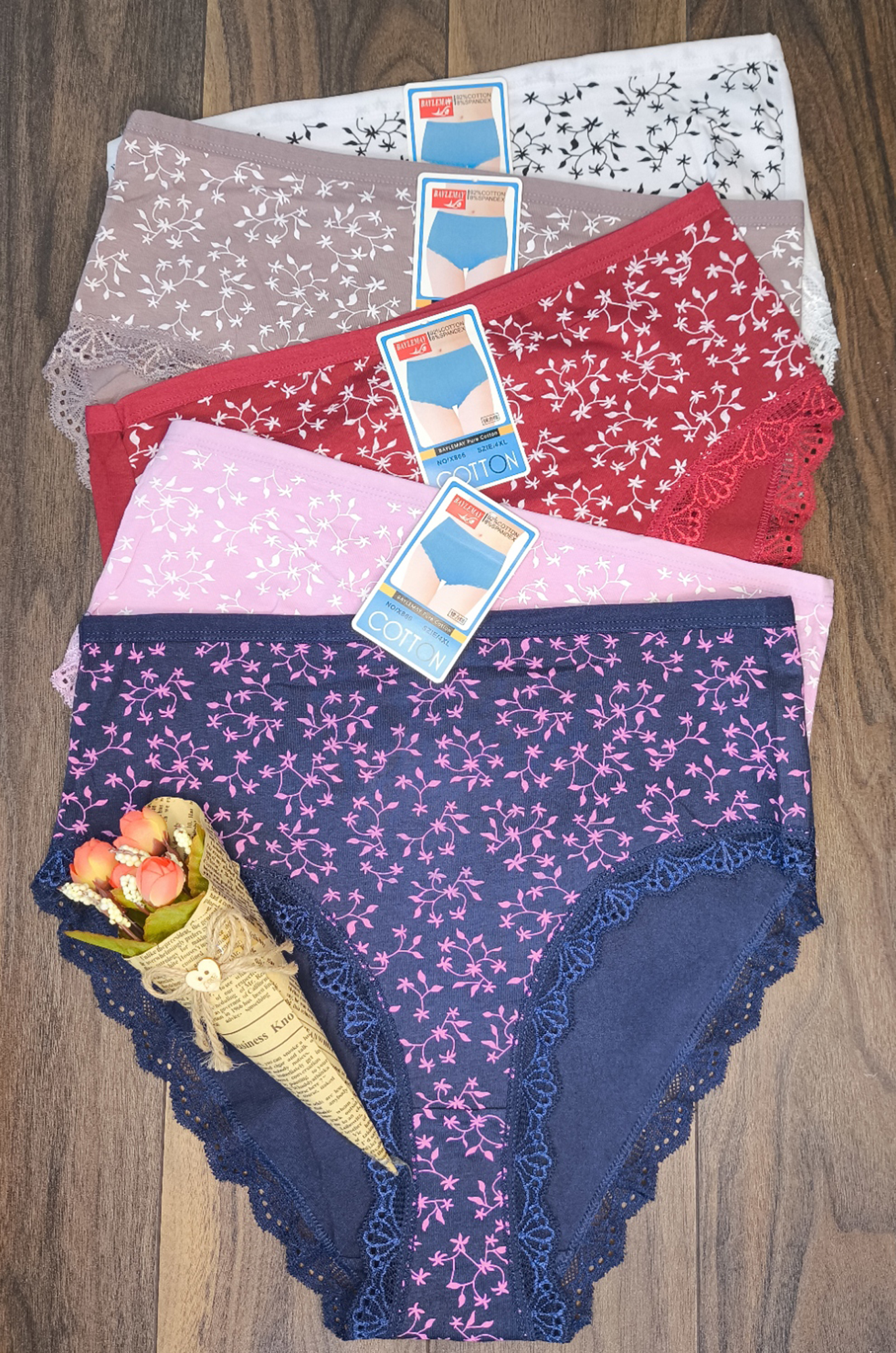 Красивые женские трусики с мелким рисунком из эластичного хлопка, по краю кружевная отделка. Модель с удобной средней посадкой. Производство Китай.