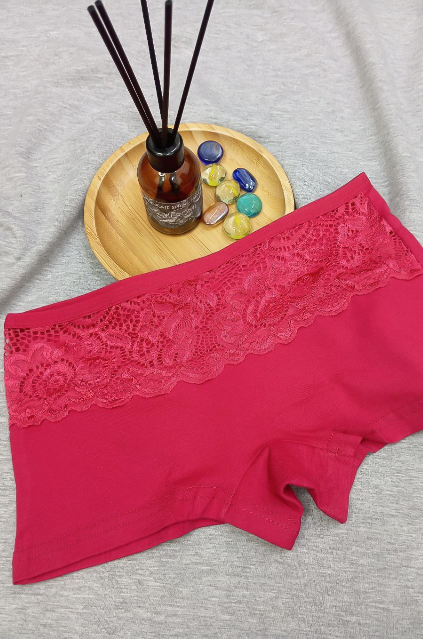Женские трусики-шортики заниженной посадки с полоской прозрачного кружева спереди.