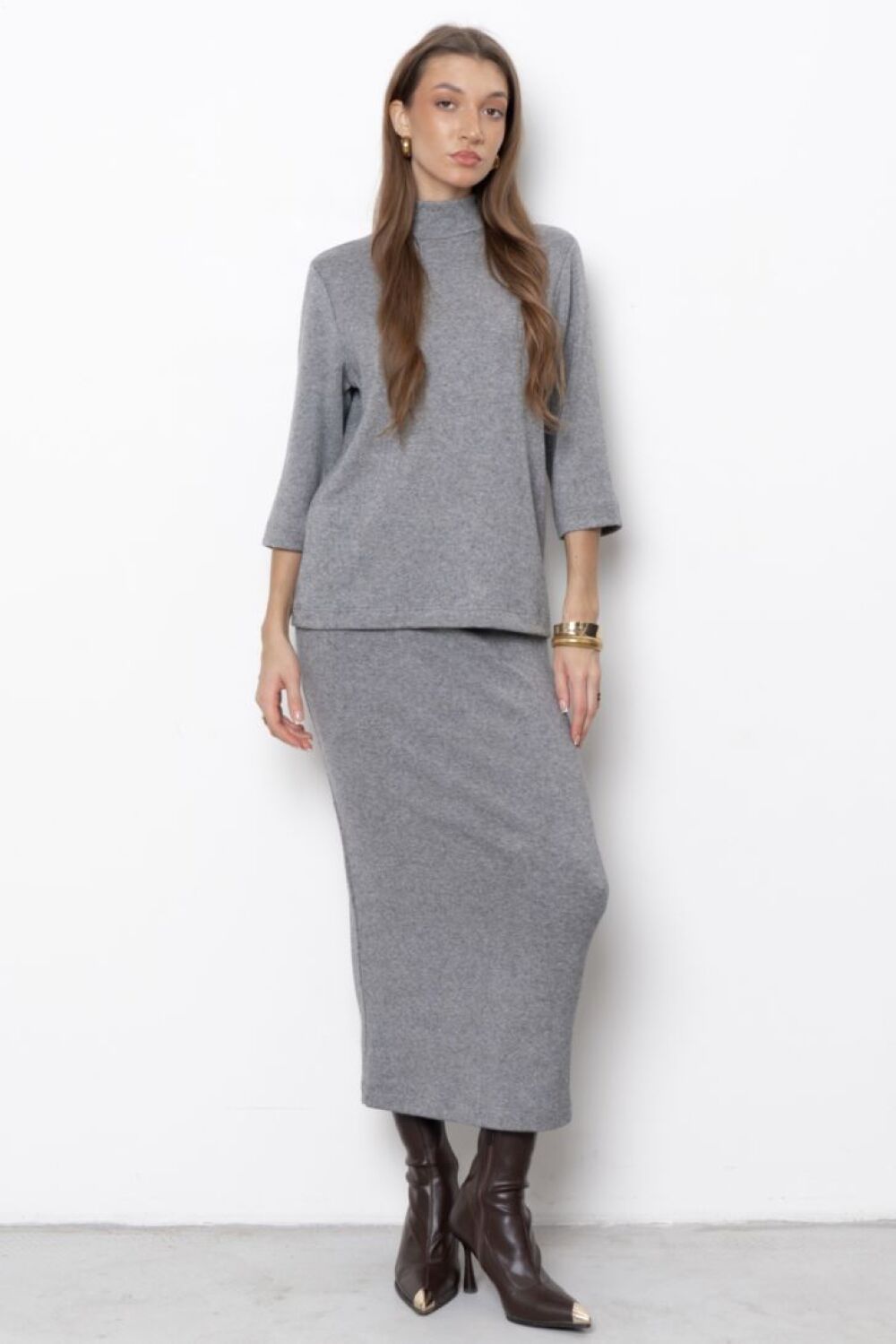 Длинная прямая юбка-карандаш с высоким мягким поясом на резинке. Представлена в трех цветовых решениях."