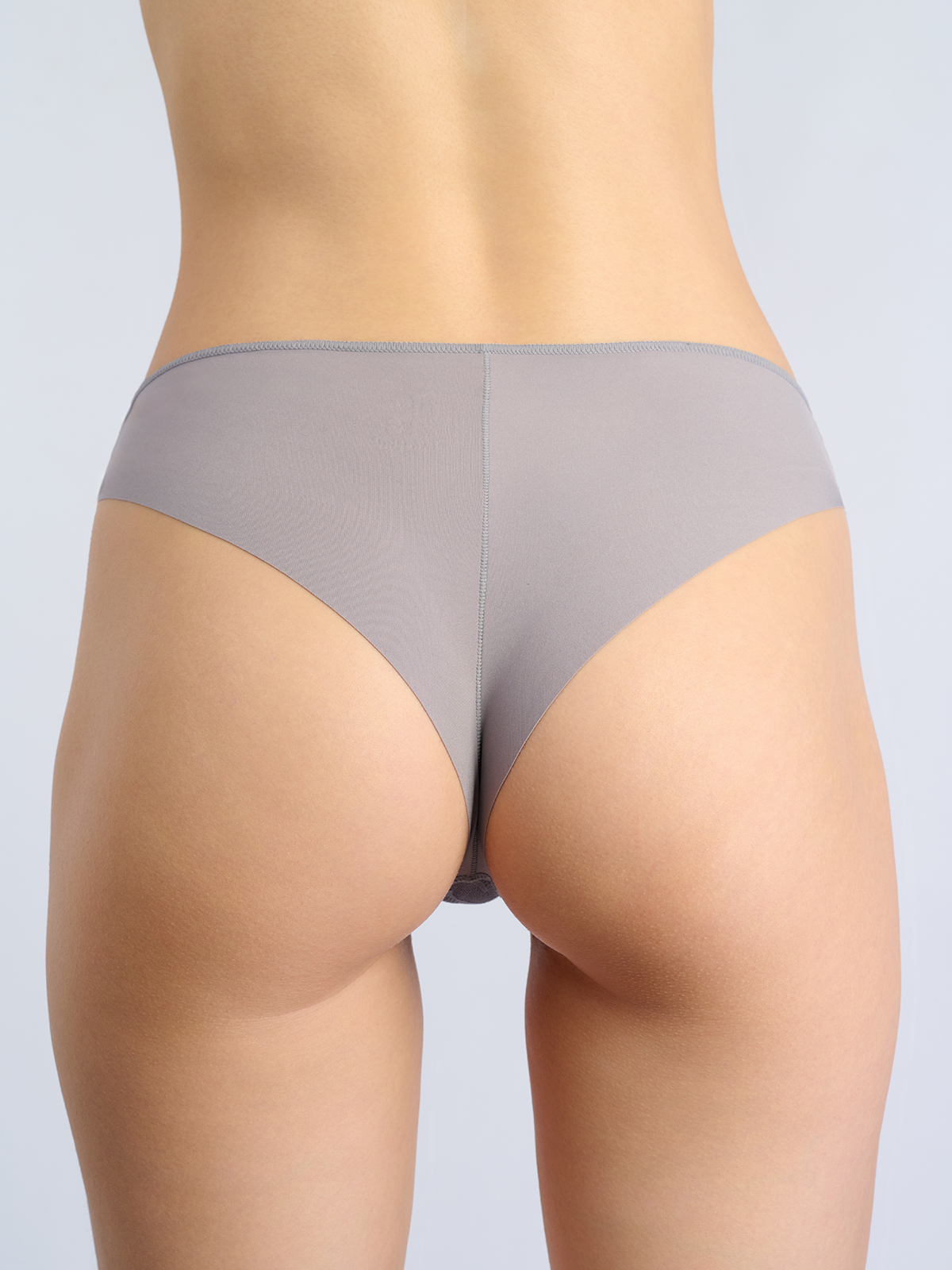 Облегающие стриги серого цвета из полиамида с эластаном и хлопковой ластовицей, обеспечивающие комфорт и идеальную посадку. Передняя часть декорирована кружевом, задняя выполнена по бесшовной технологии.
