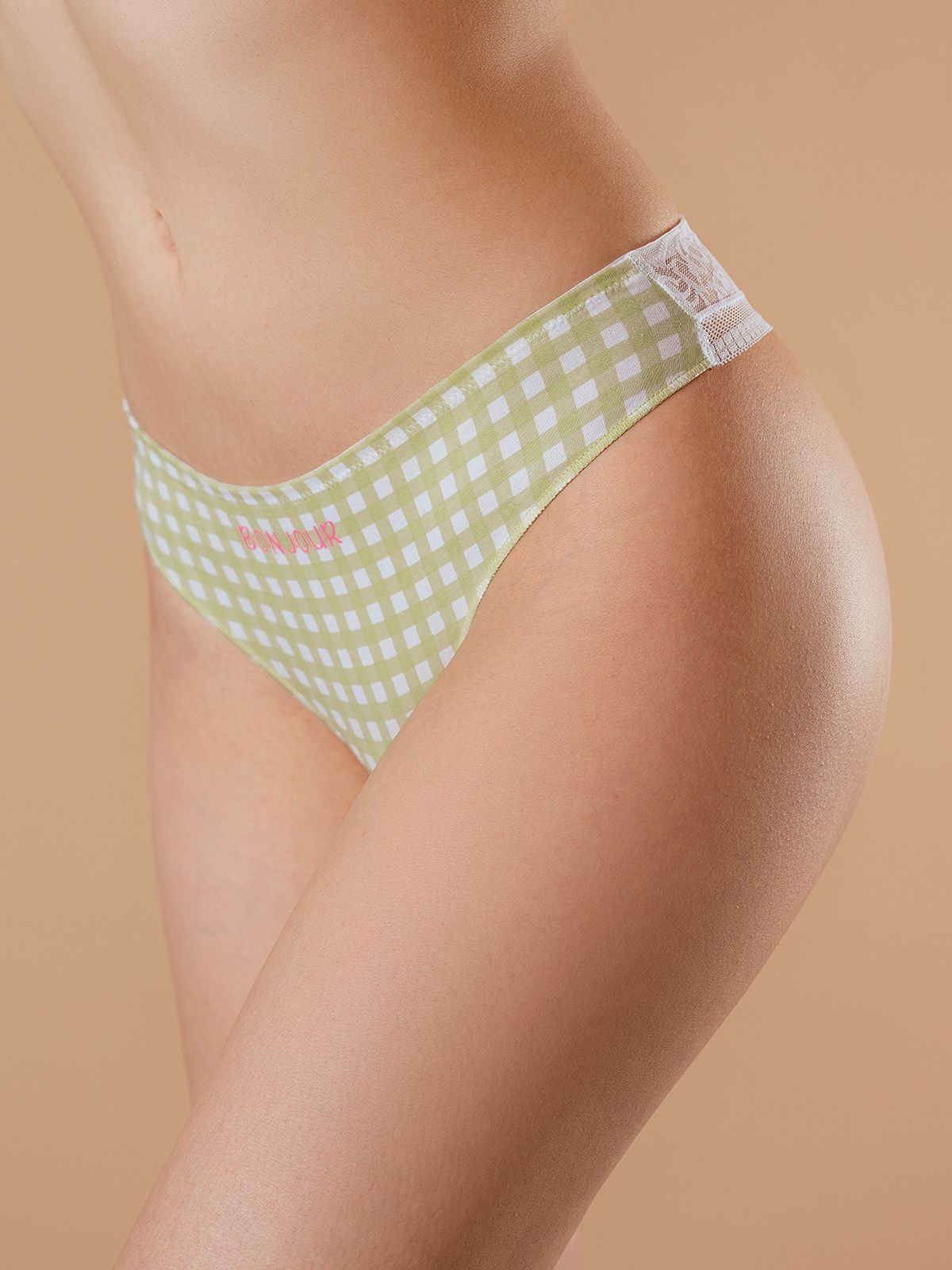 Женские трусы от торговой марки Индефини.  Трусы-стринги из хлопка, зеленого цвета с принтом, с кружевной частью сзади, на мягкой резинке, средней посадки.