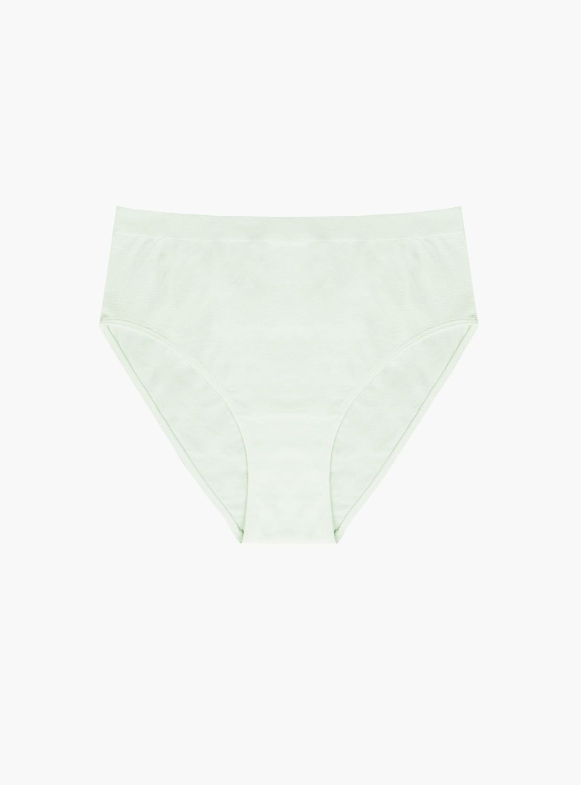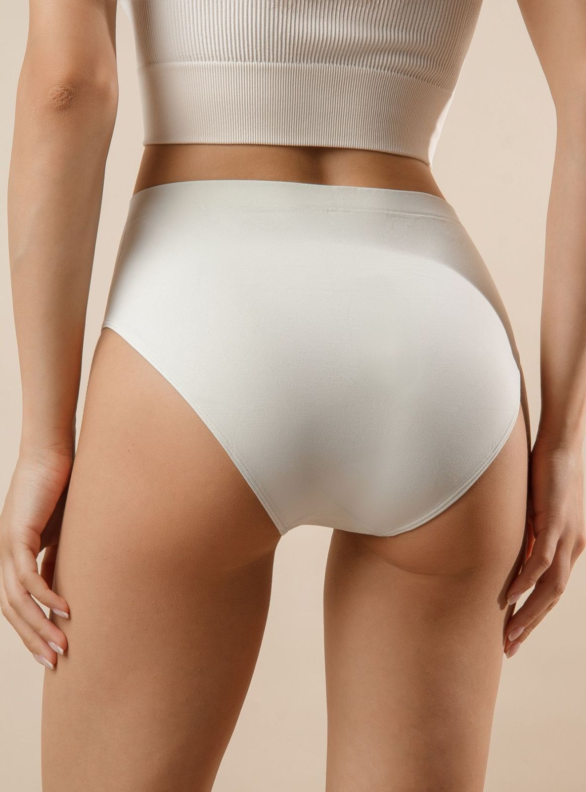 Женские трусы от торговой марки Индефини.  Трусы-слипы цвета айвори с высокой посадкой, изготовлены из мягкой микрофибры в тонкий рубчик без боковых швов, дополнены гигиенической хлопковой ластовицей, вырезы для ног обработаны плоским швом вподгибку с резинкой, широкий пояс на резинке плотно фиксирует на теле.