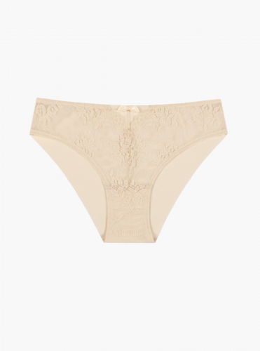 Трусы-слипы нежного молочного оттенка, выполненные из мягкой эластичной ткани. Модель украшена изящной кружевной вставкой с миниатюрным бантиком в передней части.