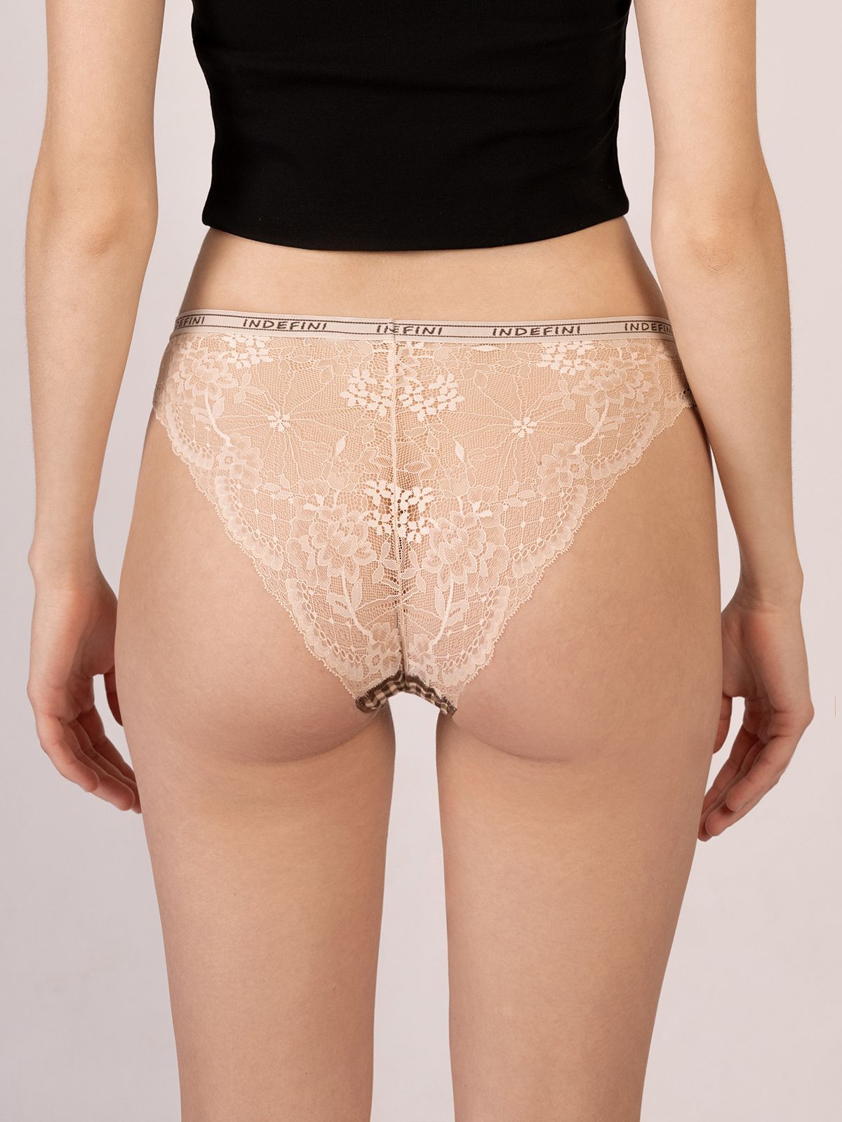 Оригинальный принт в бежево-коричневую клетку придаёт женским труса стильный и современный вид. Кружевные вставки по бокам и на задней части добавляют романтичности и женственности, делая эти трусы-слипы от Indefini не только удобными, но и визуально привлекательными.