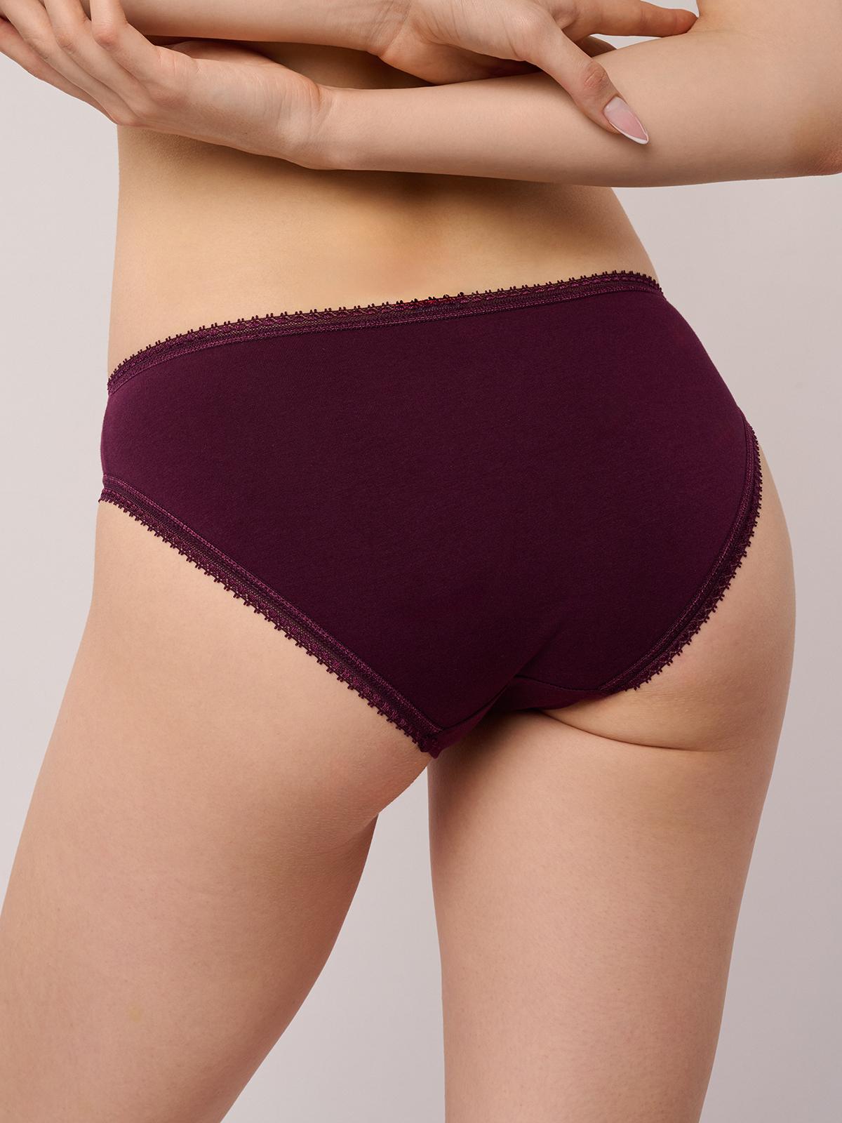 Бордовые трусы-слипы от бренда Indefini выполнены из мягкого хлопка с добавлением эластана для идеальной посадки и комфорта. Модель украшена деликатной ажурной отделкой по краям, что придаёт изделию женственность и элегантность.