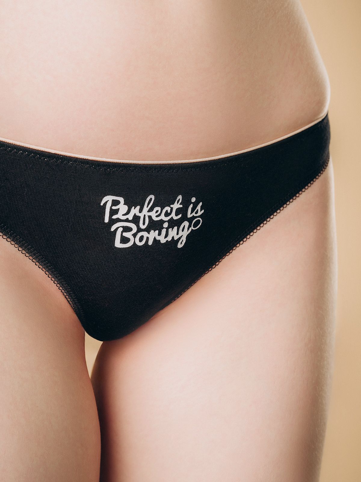 Стринги женские украшены принтом в виде надписи «Perfect is Boring».
