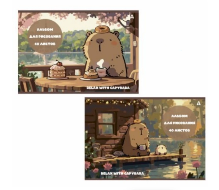 Альбом для рисования А4 40л, на скрепке, мелованный картон (стандарт), 100 г/м2, "Капибара", 2 дизайна в пленке т/у