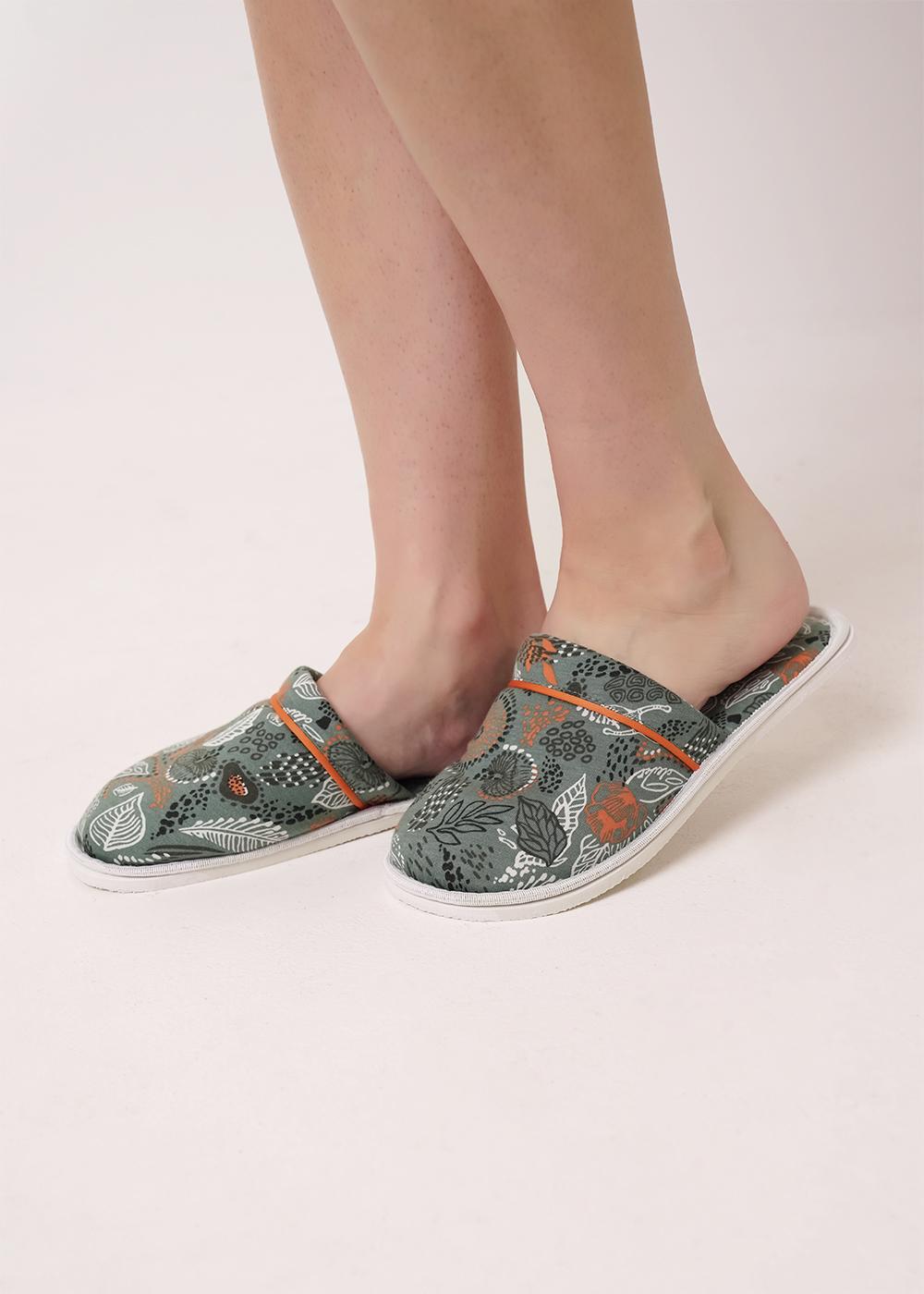 Лёгкие, домашние тапочки для дома с закрытым носом из хлопкового трикотажного полотна. В верхней части тапок контрастный кант. Толстая подошва.
