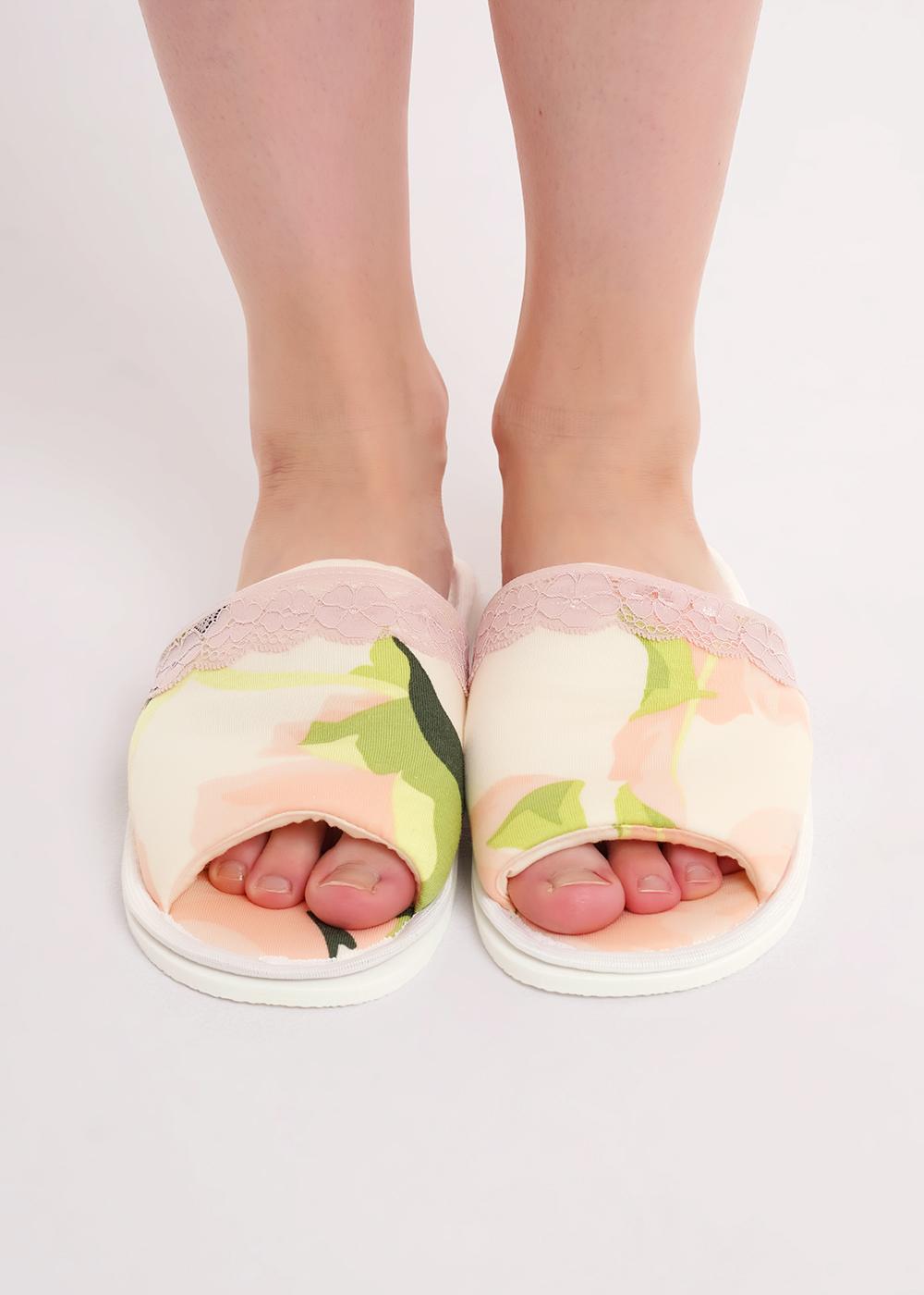 Домашние тапочки с открытым носом из хлопкового трикотажного полотна с добавлением модала. В верхней части тапок кружево. Толстая подошва.