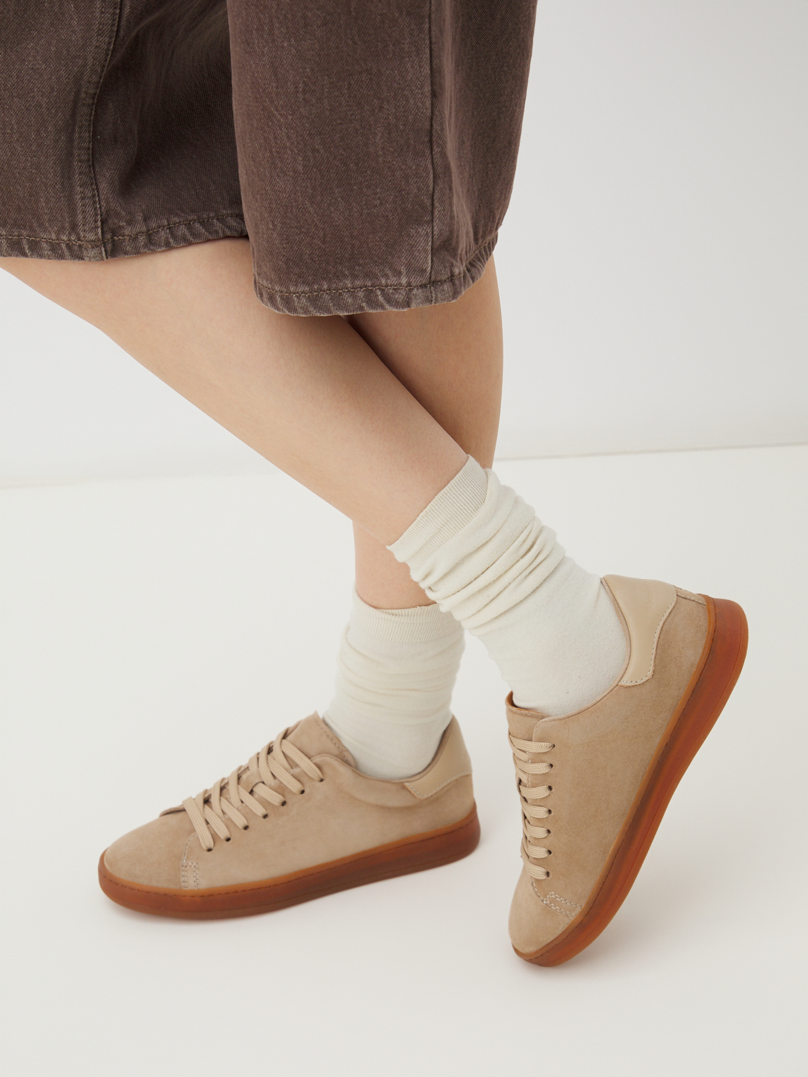 ​Каучуковые подошвы не промокают, их можно носить в любую погоду. Каучук переносит морозы лучше резиновых подошв: он меньше грубеет и не теряет эластичности. Обувь с каучуковой подошвой – хороший выбор, если вы много времени проводите на ногах. Характерная липкость материала делает подошвы нескользкими, вы будете чувствовать себя уверенно на разных покрытиях (плитке, ламинате, асфальте). Подошву на основе натурального каучука можно узнать по маркировке «Lactae Hevea» или «Latex 100% naturel».