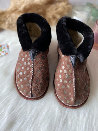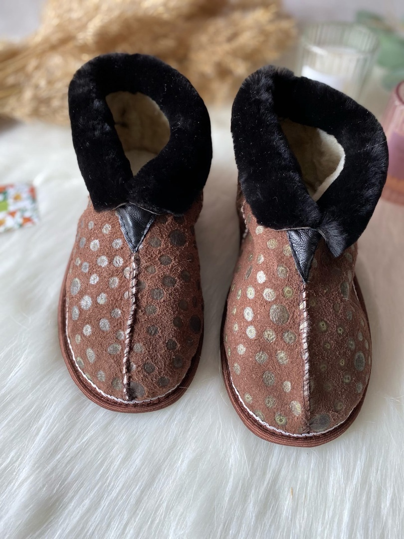 Чуни из натуральной дубленой овчины "Коричневые" с принтом на кожевенной части. Задник укреплен кожаной вставкой. Выполнены полностью из натуральной овчины.