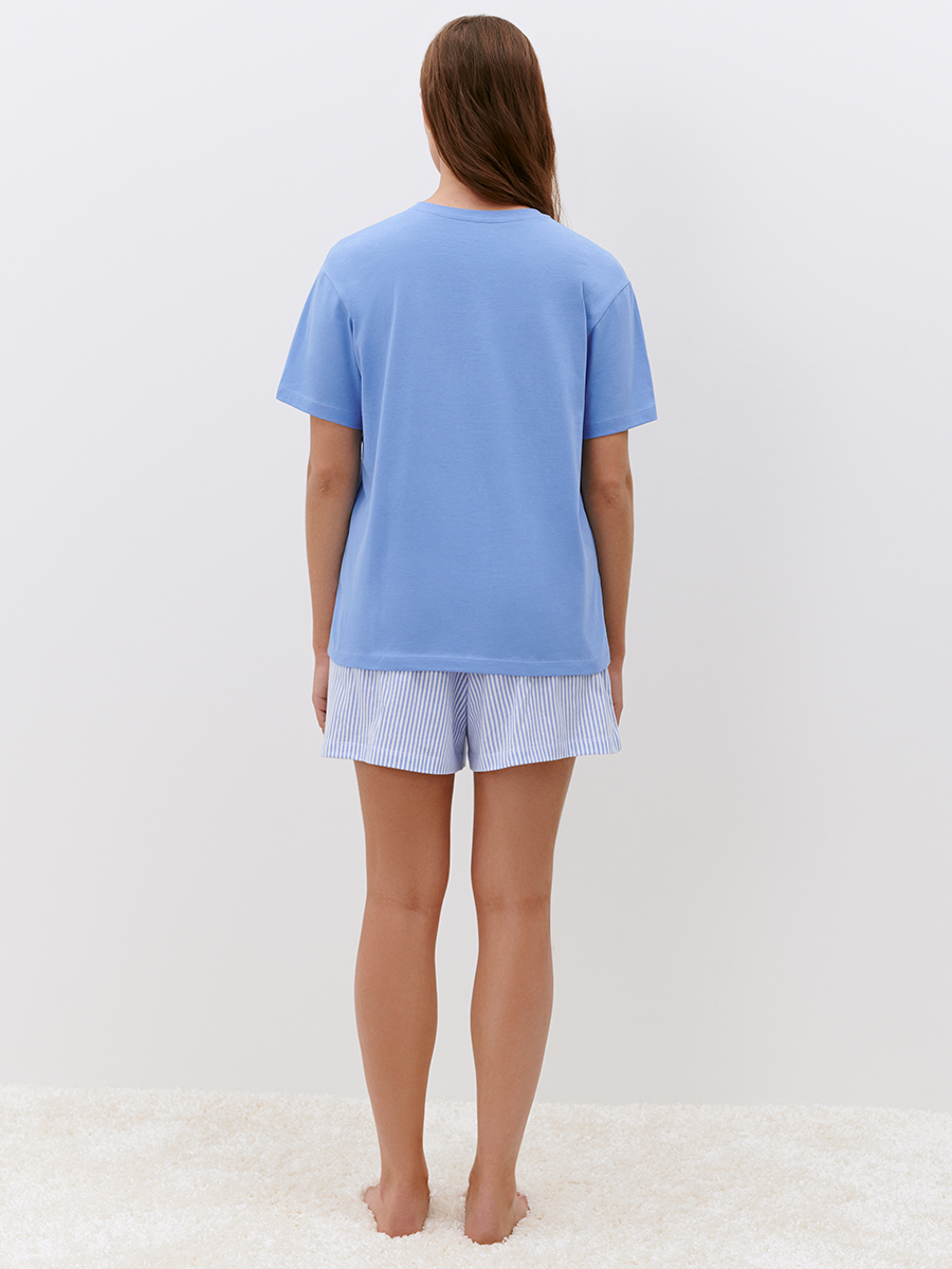 Женская пижама: прямая футболка с круглым вырезом и коротким рукавом и свободные шорты с карманами и поясом на резинке. Изготовлена из высококачественного хлопка, который отлично пропускает воздух, приятно ощущается на теле и подходит для чувствительной кожи. Пижаму можно носить как единый комплект или комбинировать с другими вещами. Идеально подходит для сна и отдыха. 100% хлопок