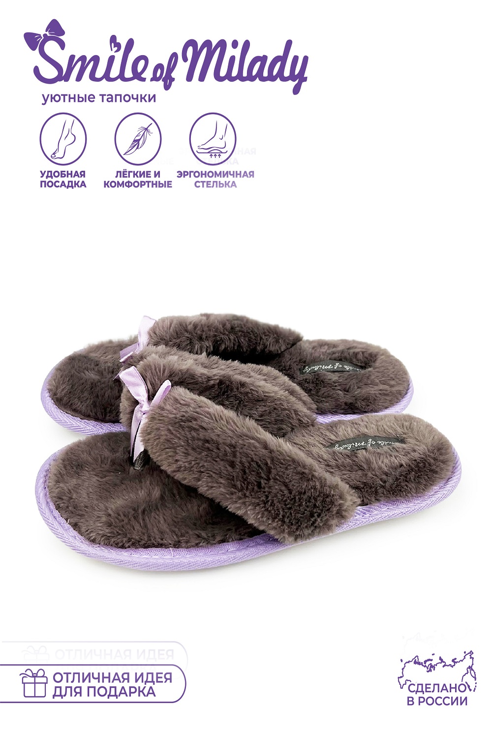 Комнатные женские тапочки вьетнамки от бренда Smile of Milady - стильная и комфортная домашняя обувь. В этих меховых тапках нога отдыхает после насыщенных рабочих будней и активных выходных. Модель теплая, пригодится в межсезонье и зиму.Мягкие домашние сланцы можно взять с собой в путешествие, в командировку, на дачу.Запасите несколько пар для гостей. Шлепанцы для женщин подойдут на широкую ногу, полную стопу. Шлепки имеют гибкую подошву из экологичного материала эва (eva). Она не скользит, достаточно мягкая и прочная, обеспечит амортизирующий эффект, снижающий усталость ног.