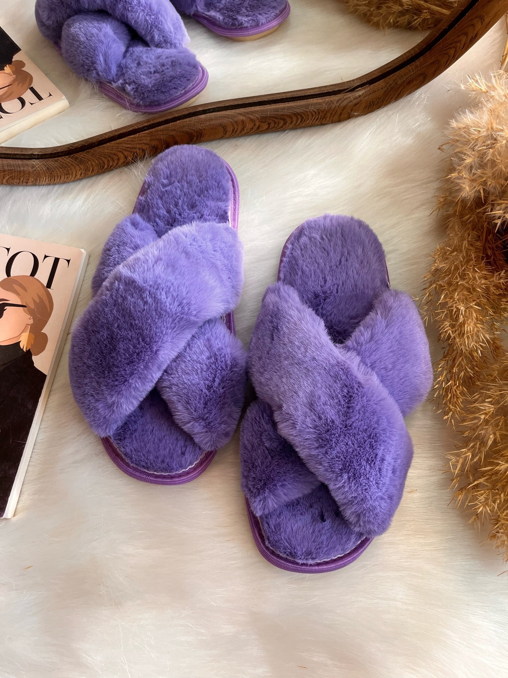 Тапочки из искусственного меха "кролик" в виде переплетенных полосочек.