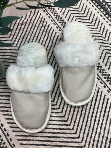 Тапочки из натуральной кожи светло-бежевого цвета + натуральной овчины