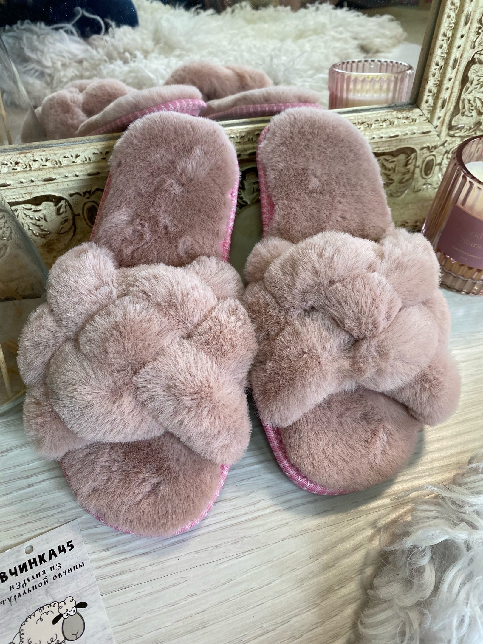 Тапочки из искусственного меха "кролик" в виде переплетенных полосочек.