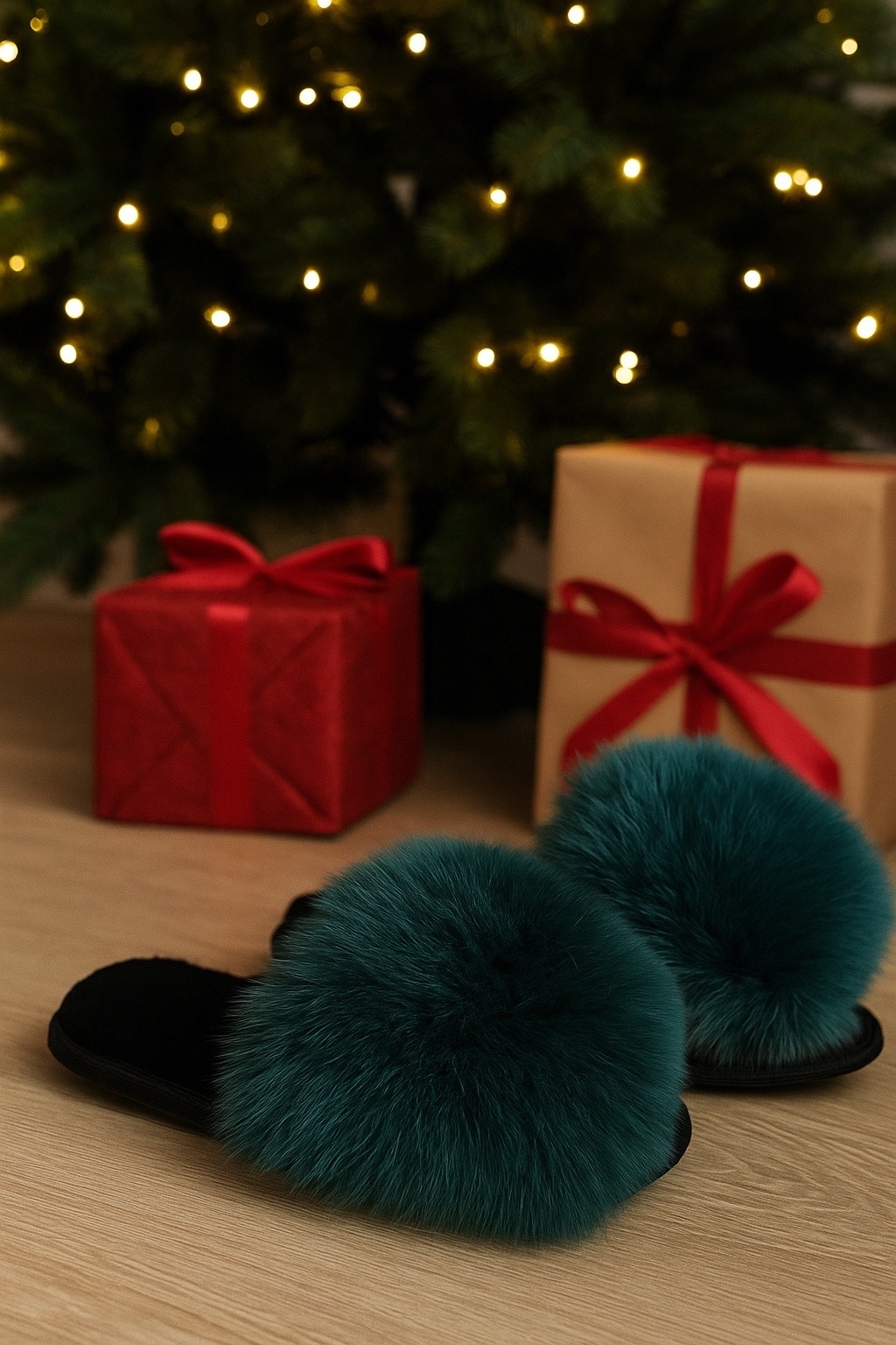Тапочки с финским песцом + овчина Изумруд/эксклюзив