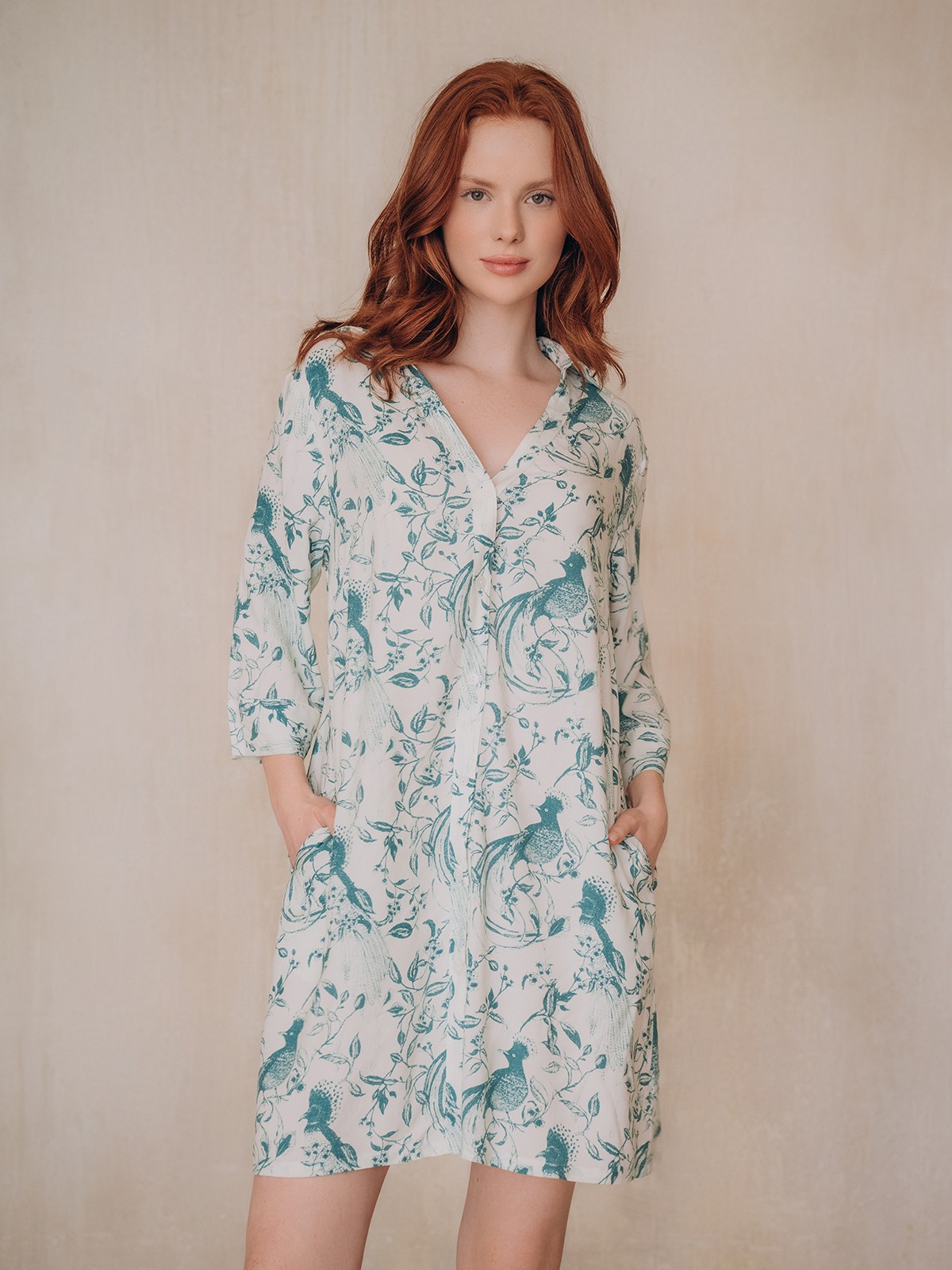 Платье легкое, свободного кроя с V-образным вырезом. Длина выше колена. Есть короткие рукава и удобные боковые карманы, куда легко помещается смартфон и другие мелочи. Платье с цветочным узором в зеленых и синих тонах на светлом фоне.
