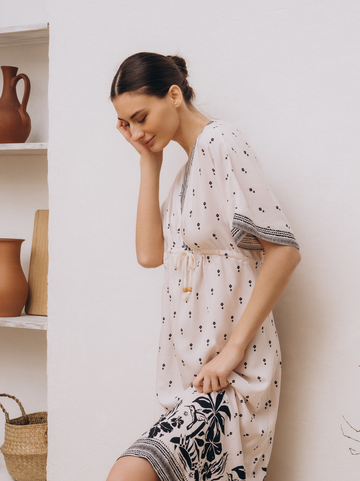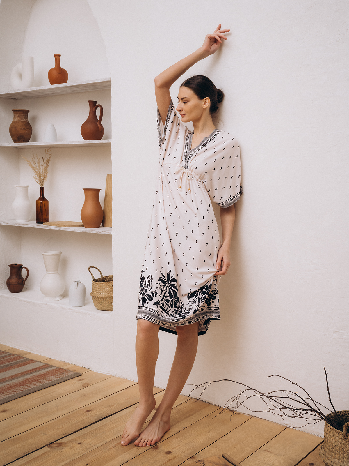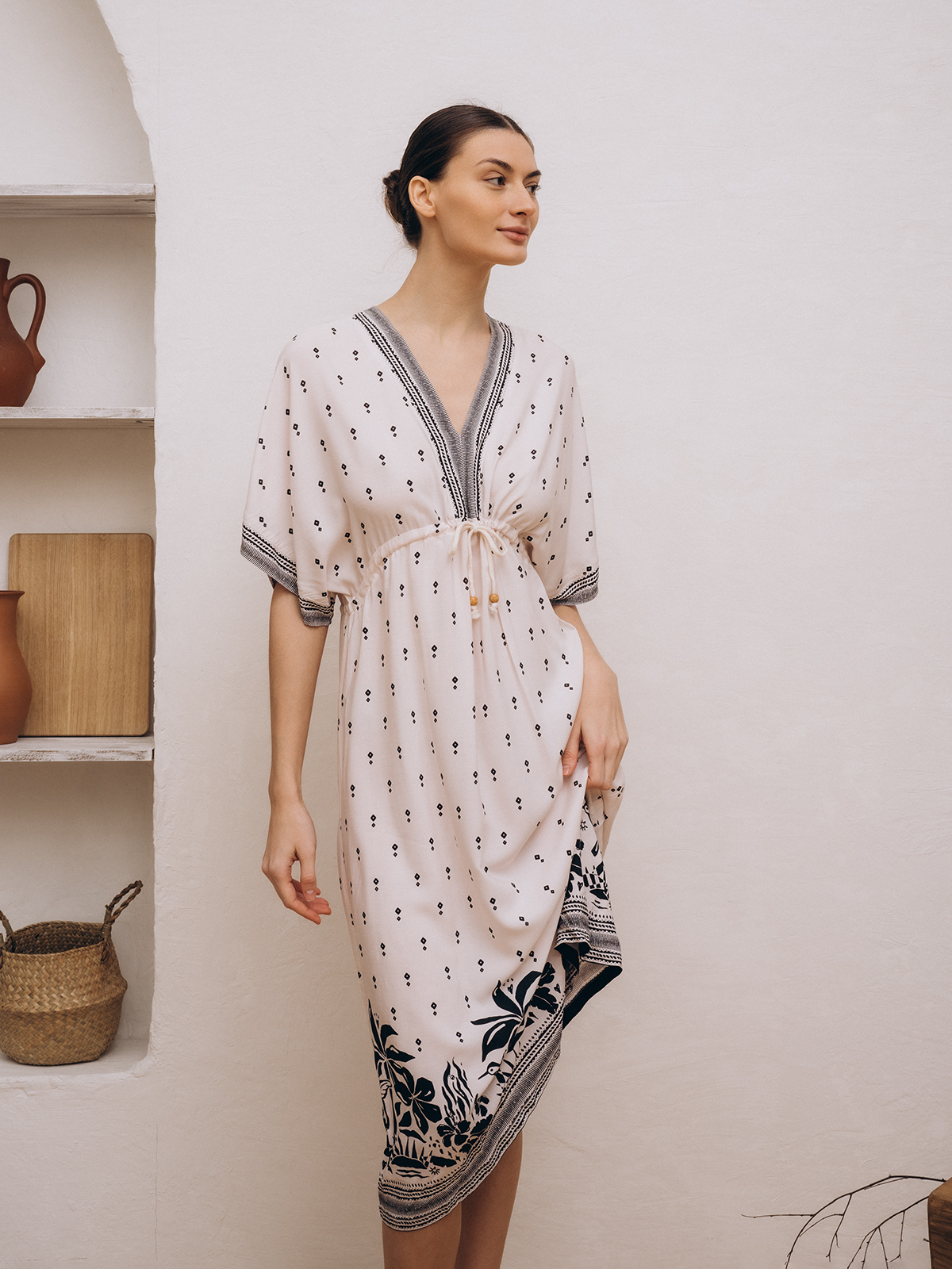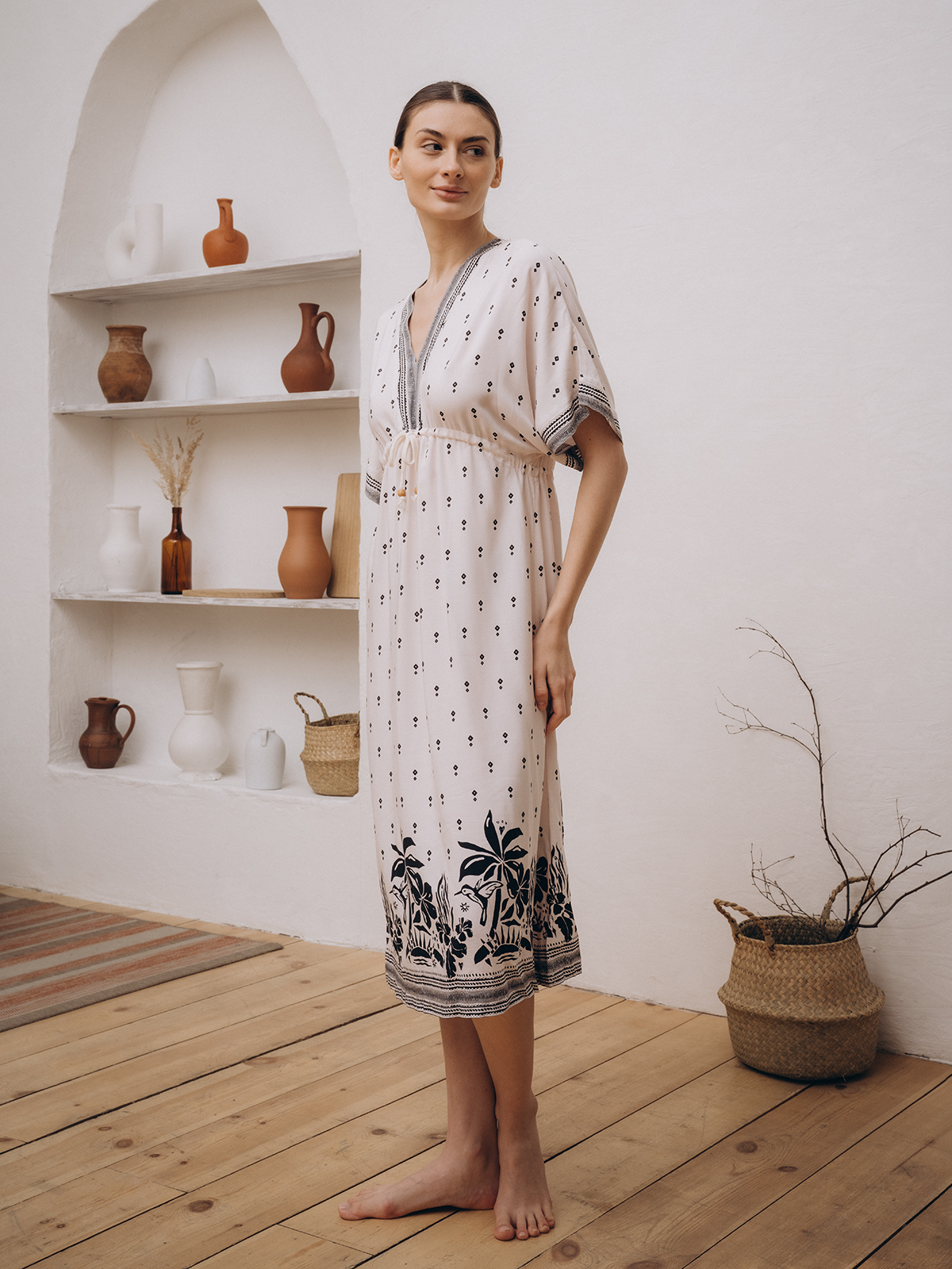 Длинное платье миди с коротким рукавом и V-образным вырезом. Сшито из вискозы – гигроскопичного, "дышащего" и легкого материала.