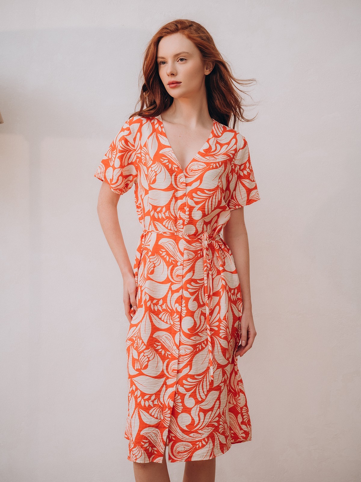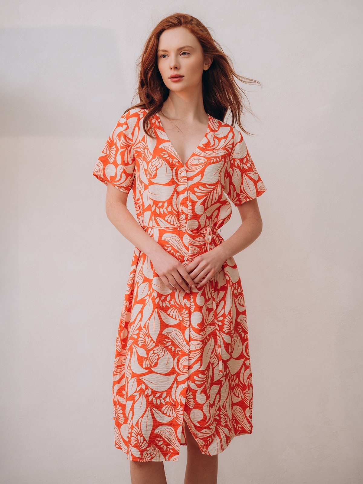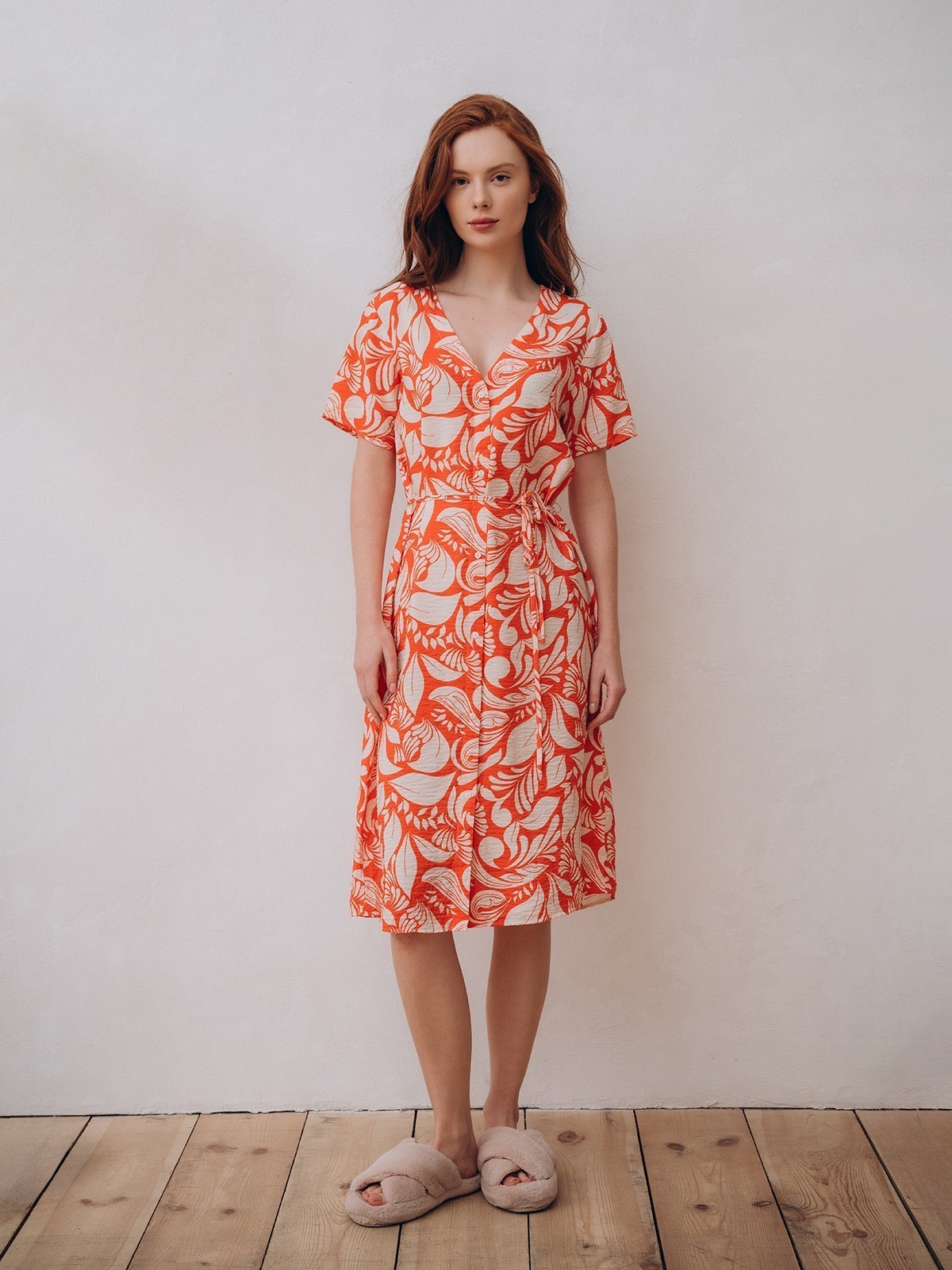 Платье миди с коротким рукавом, на пуговицах. Сшито из вискозы – гигроскопичного, "дышащего" и легкого материала. Идеальное женское платье на лето и для отдыха на пляже.