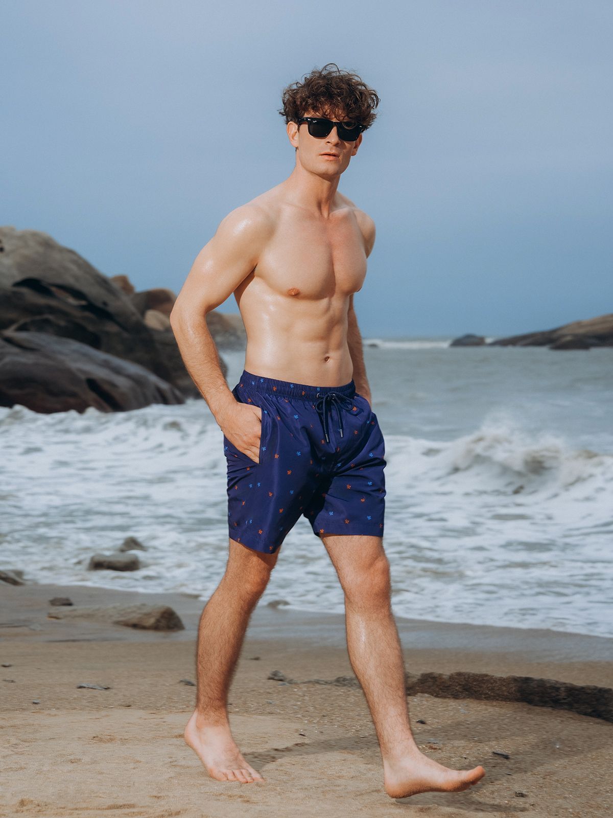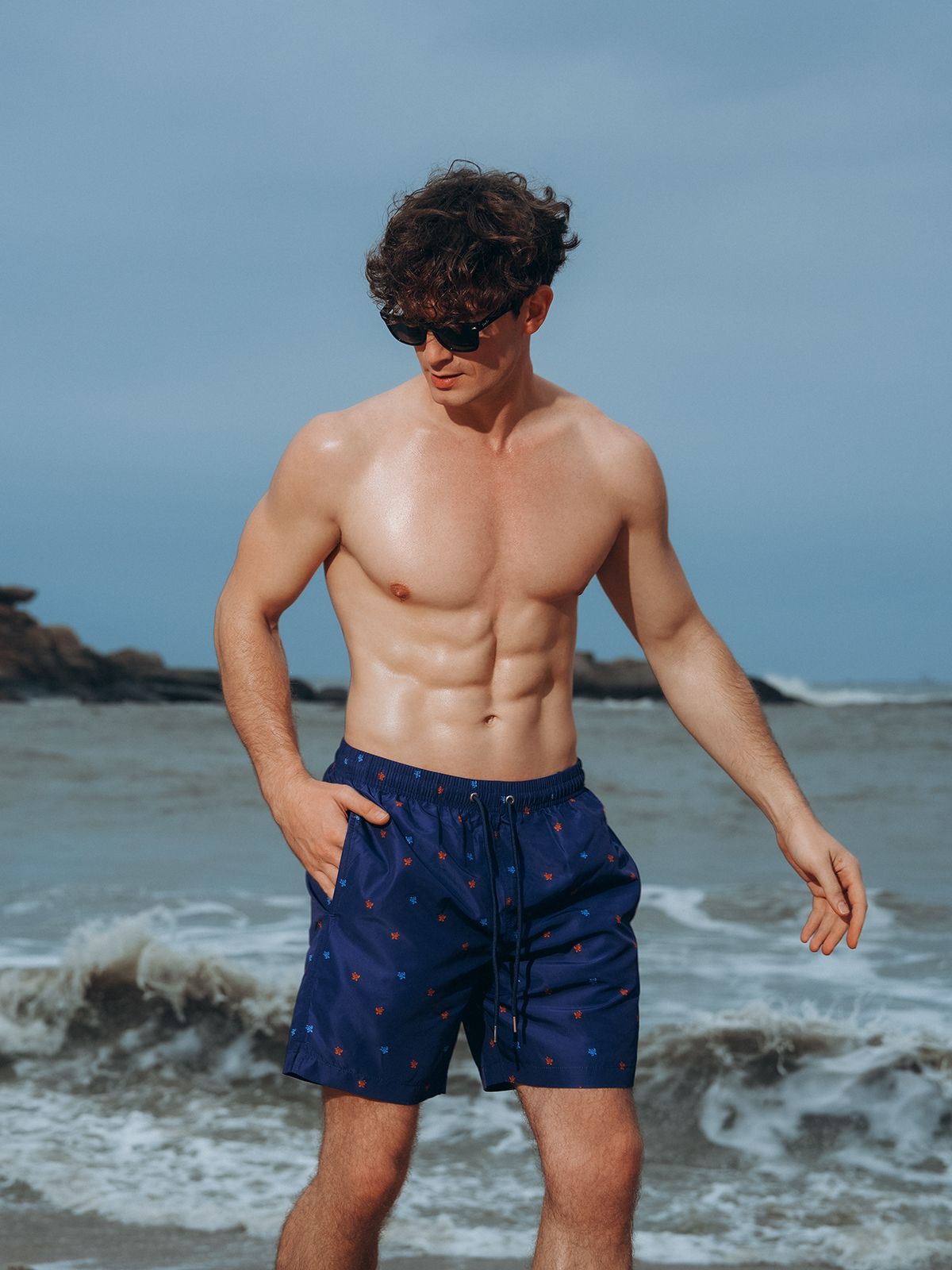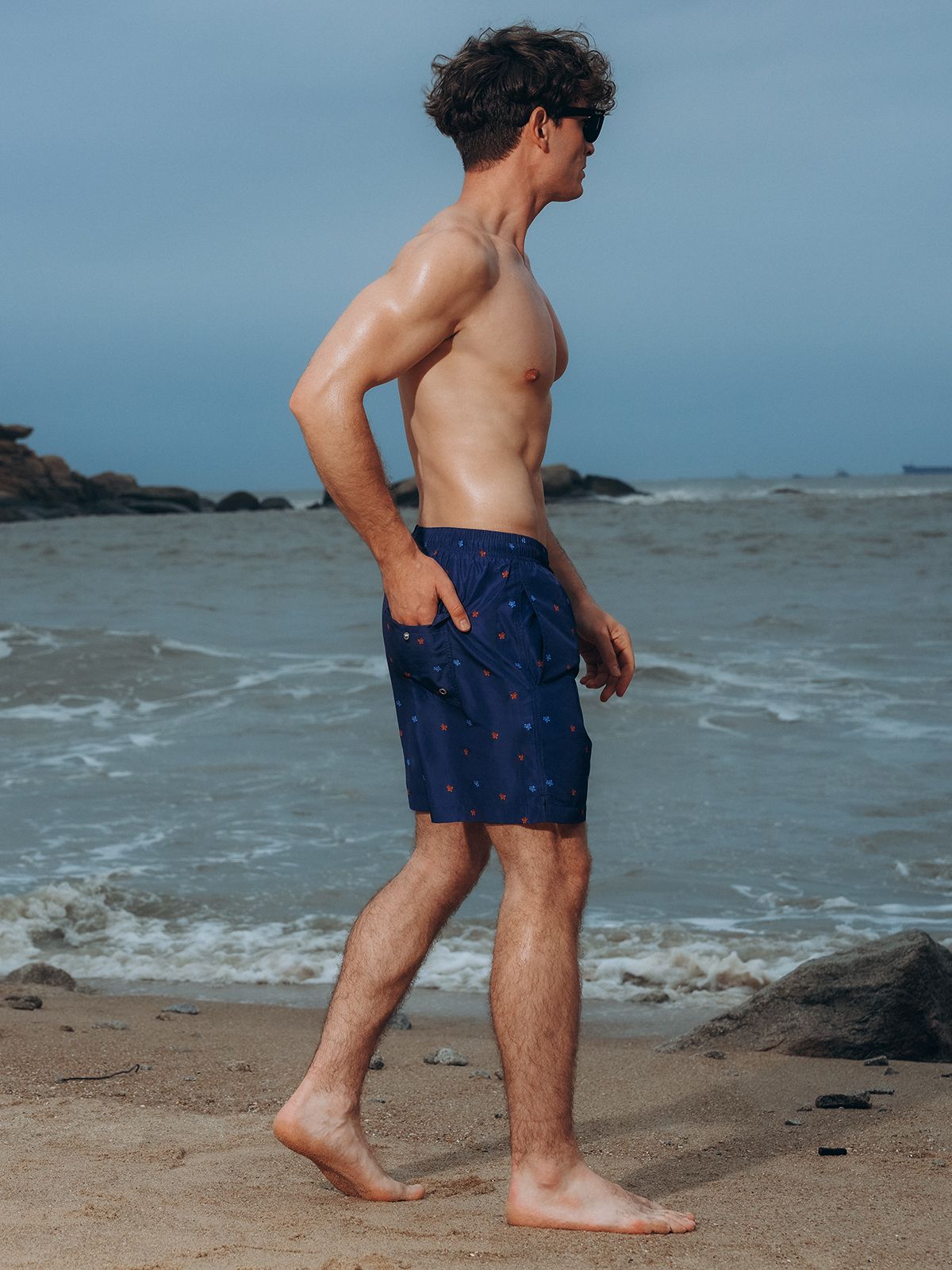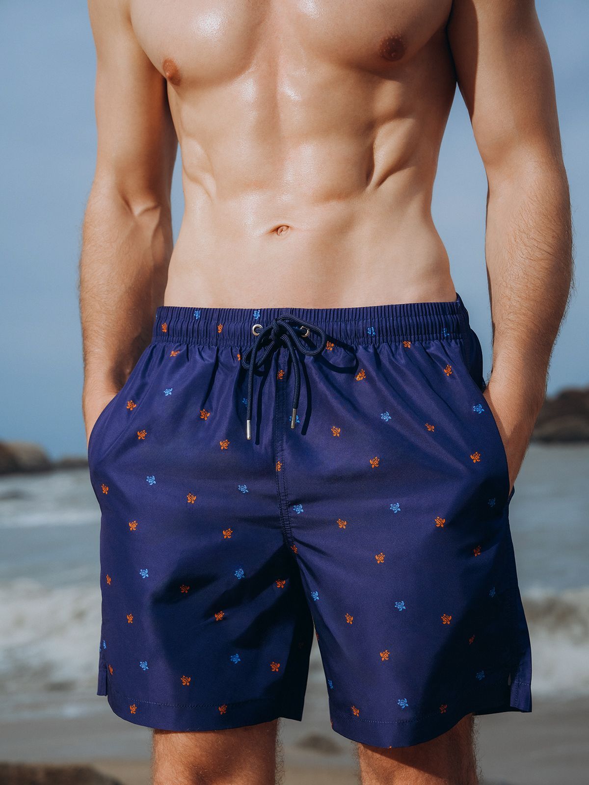 Пляжные мужские шорты бермуды. Выполнены из быстросохнущей ткани. Внутри мягкая подкладка-сеточка, как в классических мужских шортах для плавания. С помощью резинки на люверсах можно отрегулировать посадку. Также люверсы расположены сзади для вентиляции. Есть два удобных кармана по бокам и один сзади: поместятся смартфон и другие мелочи. Стиль мужских шорт универсален: в них можно как плавать, так и носить шорты каждый день.