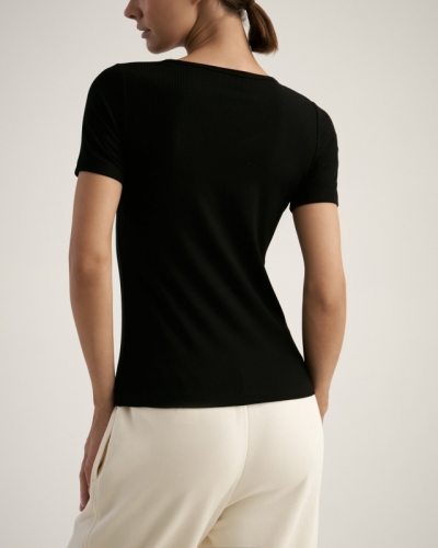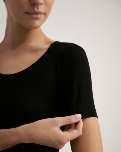 ВИСКОЗА 94% ЭЛАСТАН 6%Укороченная футболка/ облегающего силуэта. Втачной рукав. Горловина окантована.
