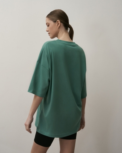 ХЛОПОК 100%Футболка свободного силуэта. Спущенное плечо. Горловина из двух деталей/ из рибаны. Декор: шелкотрафаретная печать.